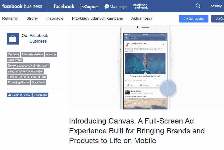 Posty – publikowane tak przez marki, jaki i osoby prywatne – to pierwsze, co przychodzi do głowy na hasło „komunikacja na Facebooku”. Trzeba jednak pamiętać, że od dawna nie są to już tylko wpisy z tekstem i grafiką. Facebook co chwila oferuje różne, bardziej zaawansowane formaty, na przykład video 360, press&hold, 3D, canvas, carousel, live streaming, stories.