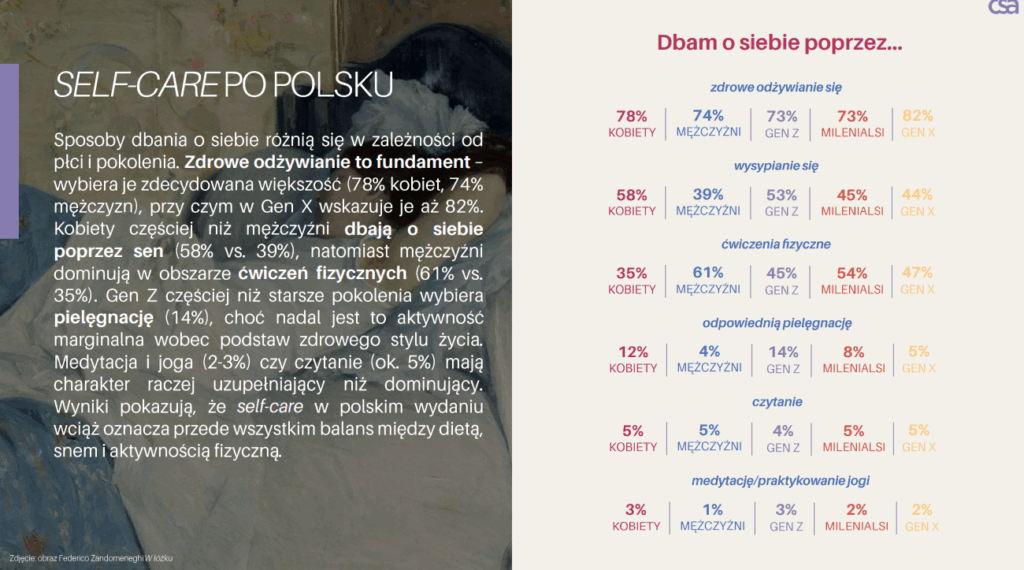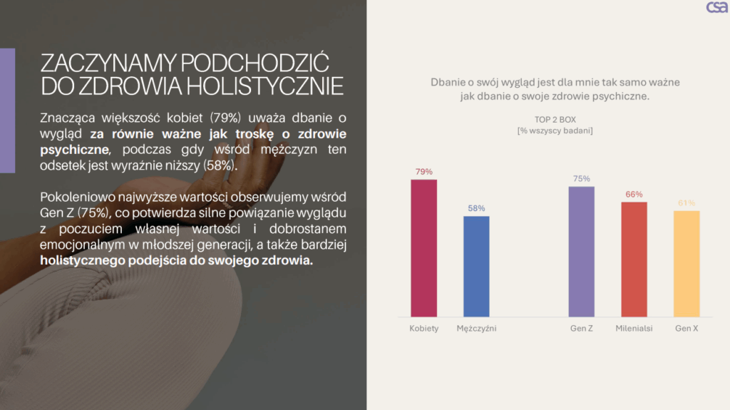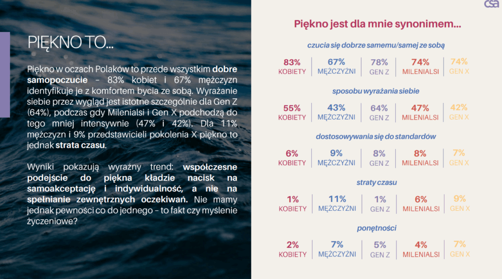 Według wyników raportu CSA „Nowe olicze piękna”, piękno Polacy utożsamiają przede wszystkim z dobrym samopoczuciem – tak deklaruje 83% kobiet i 67% mężczyzn. Gen Z częściej niż starsze grupy postrzega urodę przez pryzmat wyrażania siebie (64%), podczas gdy Milenialsi (47%) i Gen X (42%) są pod tym względem mniej zaangażowani. Jednocześnie 11% mężczyzn i 9% Gen X uważa, że piękno to… strata czasu.