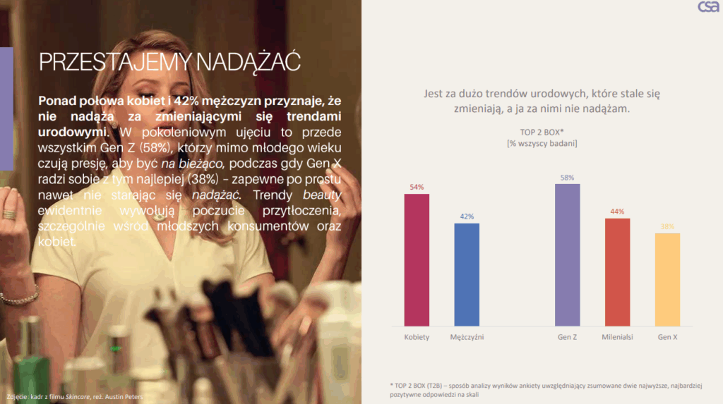 Ponad połowa kobiet i 42% mężczyzn przyznaje, że nie nadąża za kolejnymi trendami beauty. Najbardziej presję odczuwa Gen Z (58%), najmniej – Gen X (38%). Trendy stają się źródłem przytłoczenia, zwłaszcza wśród młodszych odbiorców.