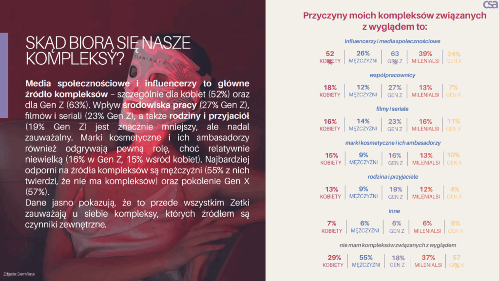 Media społecznościowe i influencerzy są głównym źródłem kompleksów – szczególnie wśród kobiet (52%) oraz Gen Z (63%). Mężczyźni wykazują dużo większą odporność: 55% z nich deklaruje, że nie ma kompleksów.