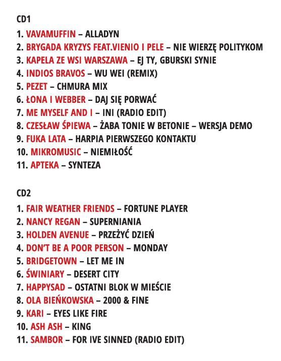 Na dwóch krążkach znalazły się 22 piosenki. Wśród nich są wcześniej niepublikowane utwory i nieznane wersje hitów, m.in. niewydany dotąd kawałek Brygady Kryzys i Vienia z legendarnej Molesty, utwór do spektaklu teatralnego Łony i Webbera, nieznana wersja demo Czesława Mozila, czy inna niż na płycie i niepublikowana wcześniej wersja piosenki ,,Ostatni blok w mieście” zespołu Happysad.