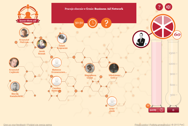 „Know Them All” to pierwsza polska aplikacja, która oparta jest o LinkedIn. Wykorzystując mechanizmy gamifikacji i sieć kontaktów użytkownika, pozwala w sposób quizowy sprawdzić, jak dużo uczestnik wie o swoich znajomych z LinkedIn. „Nasz firma jest przekonana, że sukces dobrej współpracy opiera się na dobrych i długotrwałych relacjach. Dlatego szukaliśmy rozwiązania, które pomogłoby nam zwrócić uwagę na tak ważne zagadnienie jakim jest dla nas budowanie relacji.” – mówi Michał Szymański z PwC – „Celem aplikacji jest uświadomienie użytkownikowi, poprzez wciągnięcie go w grę, że sukces w dzisiejszym biznesie opiera się w znacznej mierze na wartościowych relacjach, które następnie mogą przekładać się na konkretne, wymierne korzyści.”