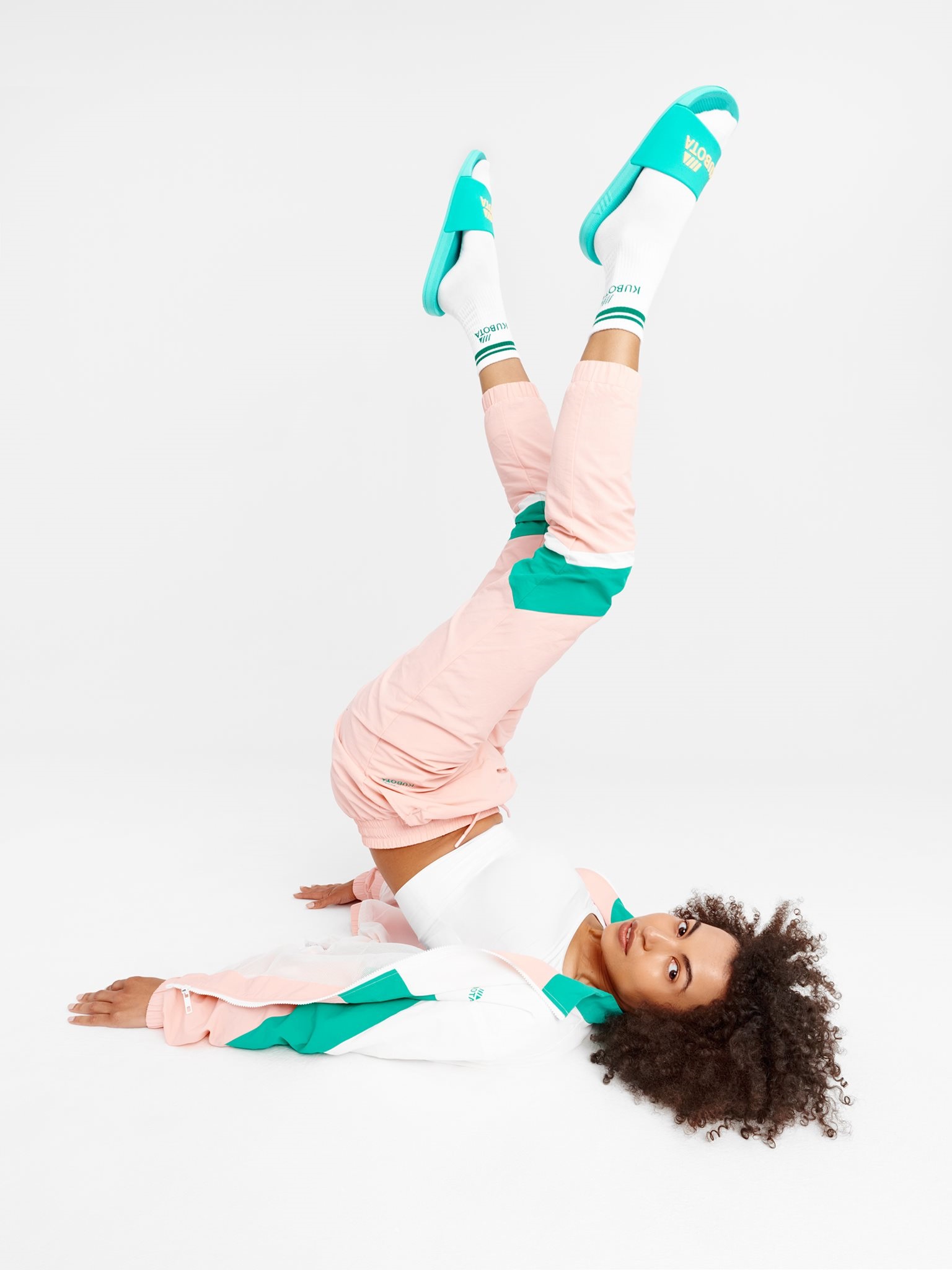 Damska część kolekcji bazuje na bieli, czerni i pastelowym różu, przełamanych mocnym akcentem soczystej zieleni, która swym odcieniem totalnie porywa i przywołuje na myśl wakacyjny vibe. Kolekcja męska to z kolei bardziej stonowana kolorystyka. Znajdziemy w niej błękit, odcienie niebieskiego z kroplą szarości oraz bordo. Nie zabrakło również ponadczasowej bieli i czerni. Obie linie łączy geometryczny, przeskalowany print, do którego inspiracją były już wcześniej wspomniane lata 90., co było zabiegiem nieprzypadkowym. Pierwsza kolekcja odzieży nawiązuje klimatem do czasów, kiedy narodziła się marka oraz kultowe klapki Kubota Rzep.
