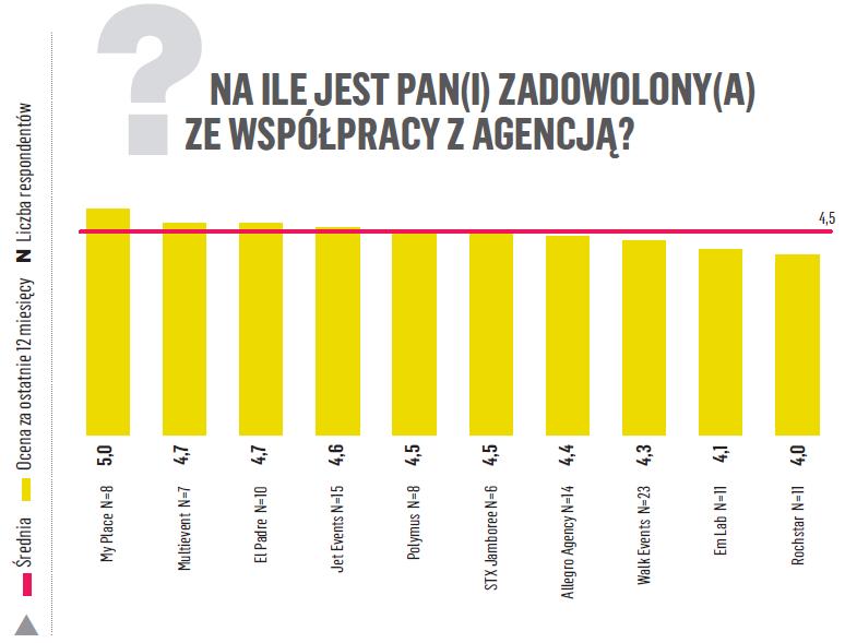 W wyniku uzyskanych odpowiedzi wyszło, że ogólnie klienci oceniają bardzo wysoko poziom świadczonych usług przez agencje eventowe. W 5-stopniowej skali ocen, średnia wyszła na poziomie aż 4,5.