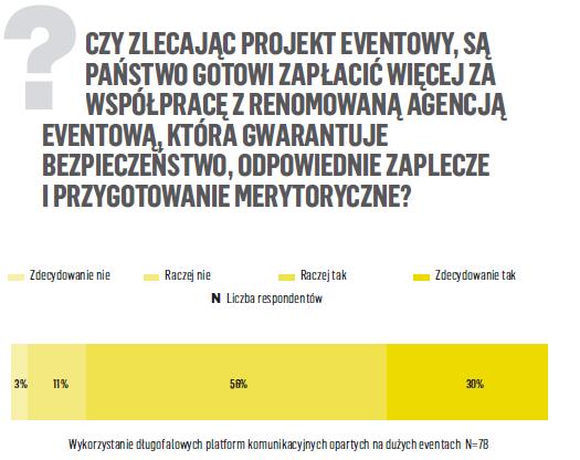 Co ważne, przebadani klienci deklarują również, że za wysoką jakość wykonanej usługi, zagwarantowanie bezpieczeństwa oraz odpowiedniego poziomu merytorycznego, są w większości w gotowe ponieść większe wydatki na dane wydarzenie (30 proc. odpowiadało „zdecydowanie tak”, a 56 proc. „raczej tak”).