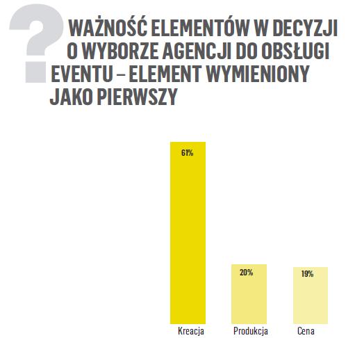 Z raportu wynika, że czynniki, na które w pierwszej kolejności klienci zwracają uwagę podczas podejmowania decyzji, z którą firmą będą chcieli zorganizować event, to kreacja (61 proc. odpowiedzi), a następnie produkcja i cena (odpowiednio 20 proc. i 19 proc.).