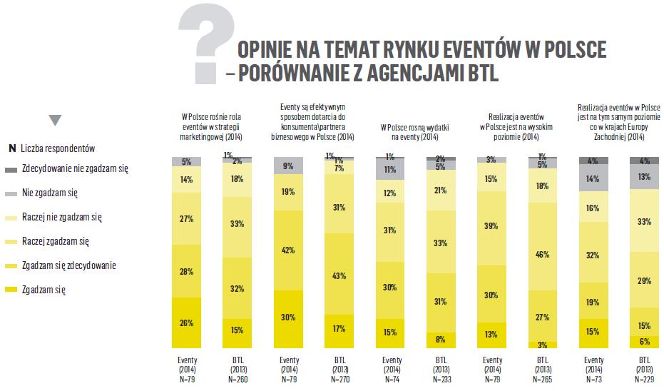 Ciekawie również prezentuje się zestawienie porównawcze opinii na temat rynku eventów z BTL w Polsce. Generalnie klienci bardziej cenią w swoim marketing’u mix,event marketing. Co ważne dotyczy to kluczowych obszarów: roli, efektywności, poziomu wydatków oraz jakości realizacji.