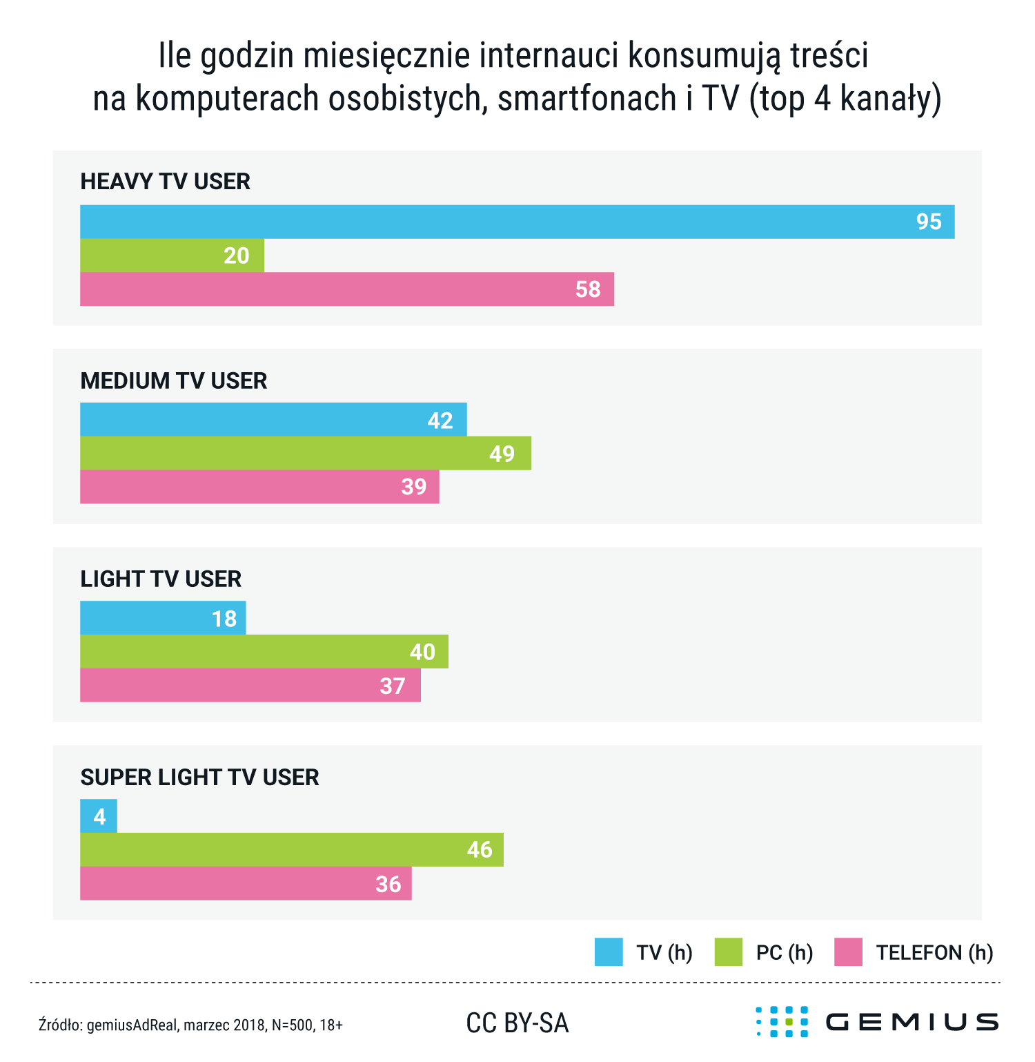 Gemius zbadał również, ile godzin średnio miesięcznie poszczególne grupy użytkowników spędzają przed ekranem komputera, smartfona oraz telewizora. W przypadku telewizji badanie objęło wszystkie cztery najbardziej liczące się na rynku kanały telewizyjne ꟷ Polsat, TVN, TVP1 i TVP2. Ich najwierniejsi widzowie spędzają średnio 95 godzin w miesiącu na oglądaniu telewizji i 58 godzin na przeglądaniu internetu na smartfonach. To grupa, która jest najbardziej aktywna na urządzeniach mobilnych, a jednocześnie najkrócej korzystająca z internetu na komputerach osobistych. Z kolei okazjonalni telewidzowie wymienionych kanałów znacznie więcej czasu spędzają surfując po sieci przy użyciu komputerów osobistych.