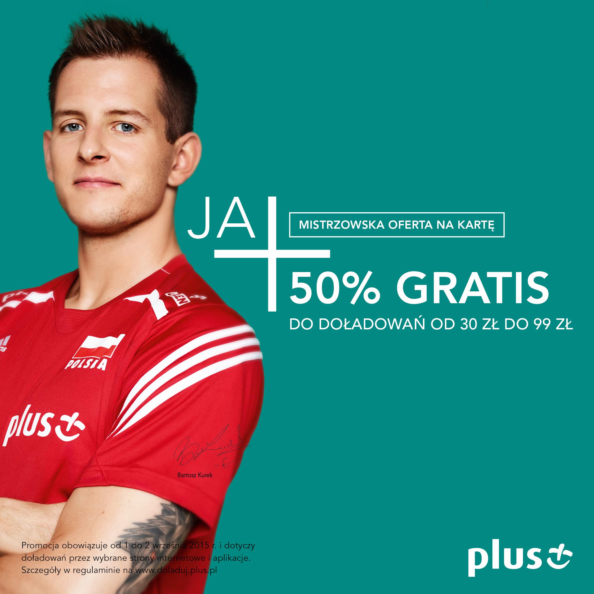Dodatkowe 50% wartości doładowania można otrzymać po dokonaniu zasilenia swojego konta za pomocą kanału bankowo-internetowego. Promocja dotyczy klientów usług „na kartę”: JA+ Na Kartę, Plus na Kartę, Plush na Kartę, Simplus, Sami Swoi, 36,6, JA+ Internet Na Kartę, Plus Internet Na Kartę, którzy muszą dokonać zasilenia w wysokości 30-99 zł. Dla klientów ofert JA+ Mix, Plus Mix oraz Plush Mix bonus promocyjny naliczany jest tylko przy doładowaniu nominałem 10 i 20 zł.