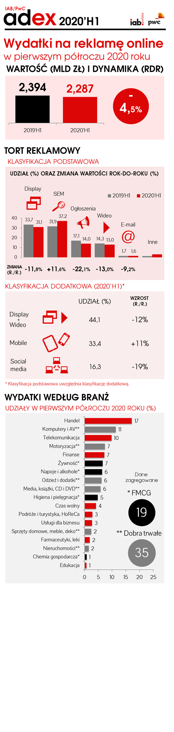 W pierwszym półroczu 2020 roku po raz pierwszy w historii badania IAB Polska/PwC AdEx wydatki na reklamę online odnotowały spadek. Pandemia, która wymusiła na reklamodawcach zmiany w planach marketingowych, konieczność modyfikacji założeń całych kampanii reklamowych czy wręcz zamrażanie budżetów, wpłynęła na ten jedyny dotychczas segment komunikacji, który cieszył się niezmiennymi wzrostami. Pierwsze oznaki wyhamowania były widoczne już w marcu. Wtedy jednak pierwsze dwa miesiące roku były na tyle dobre (indeks wzrostu za styczeń i luty wyniósł 8%), że cały kwartał skończył się na plusie (4%). W kwietniu i maju spadki jednak sięgały już poziomu -15%. Odwrócenie trendu przyniósł dopiero czerwiec, choć i w tym miesiącu zanotowano indeks ujemny (-5%).