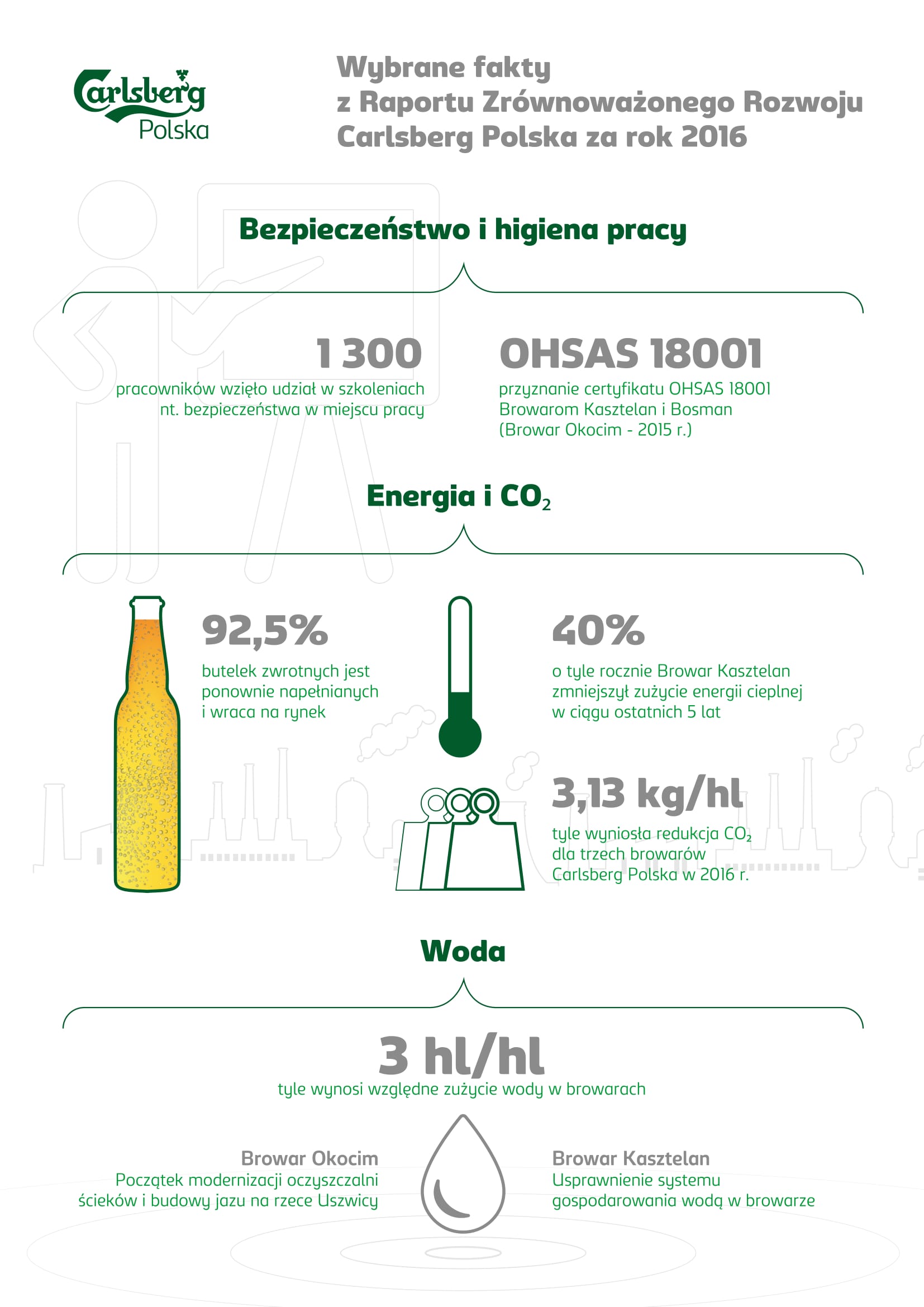 Ograniczenie emisji CO2, zużycia energii oraz wody traktowane są w Grupie Carlsberg priorytetowo. Carlsberg Polska inwestuje w innowacyjne rozwiązania technologiczne. Dzięki modernizacjom przeprowadzonym na przykład w Browarze Kasztelan w ciągu ostatnich 5 lat zmniejszono roczne zużycie energii elektrycznej o 40 proc, zaś energii cieplnej o 20 proc. To plasuje Kasztelana na pozycji lidera w tym obszarze w Grupie Carlsberg. Z kolei w brzeskim Browarze Okocim zainwestowano ponad 10 mln złotych w modernizację oczyszczalni ścieków, co pozwoli spełniać najnowsze normy środowiskowe.
