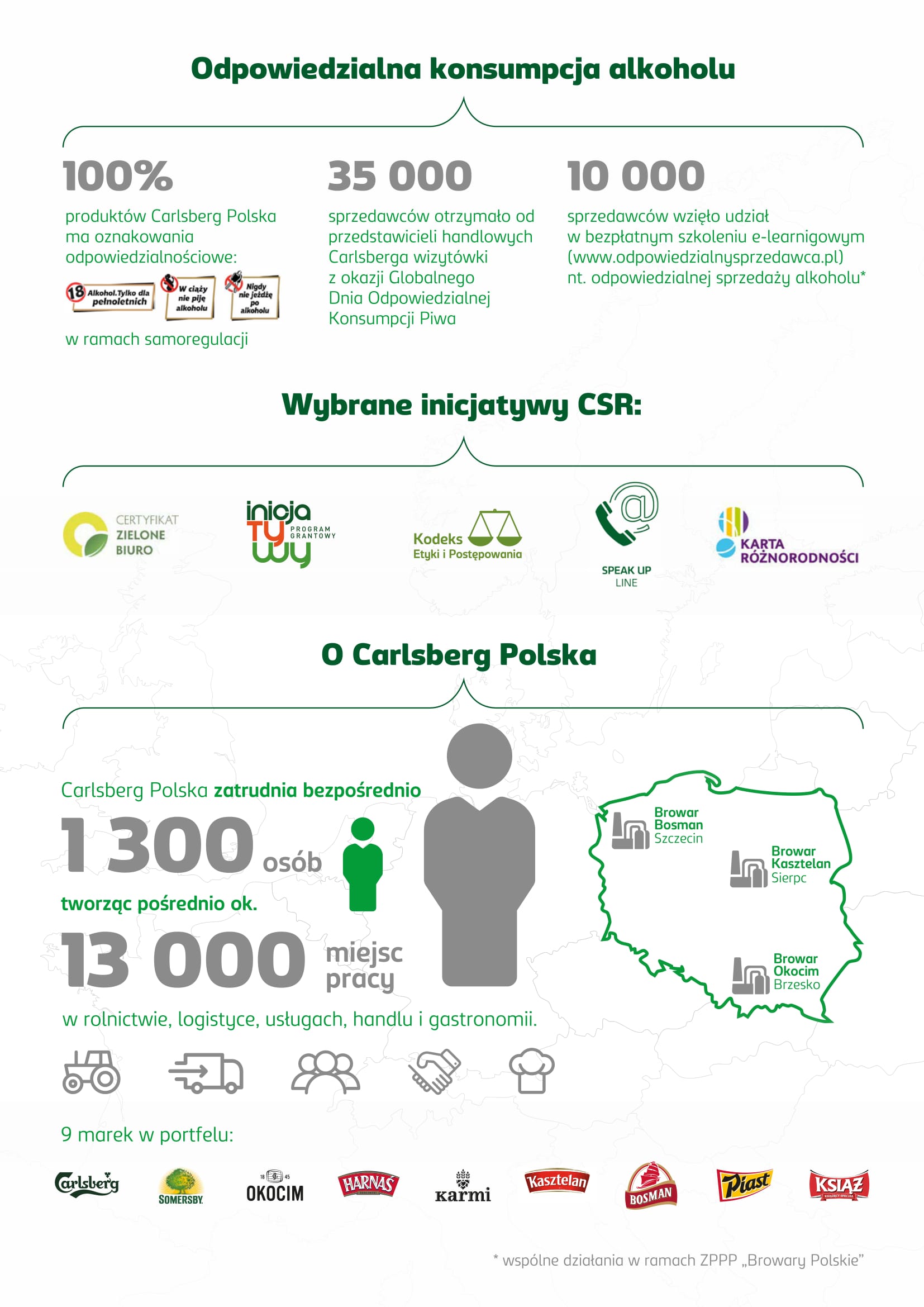 Bardzo ważnym elementem działań edukacyjnych prowadzonych przez Grupę Carlsberg jest podnoszenie świadomości na temat odpowiedzialnej konsumpcji alkoholu. W Polsce Carlsberg podejmuje samodzielne inicjatywy w tym zakresie, jak i współpracuje na tym polu z innymi producentami piwa w ramach Związku Pracodawców Przemysłu Piwowarskiego „Browary Polskie”. Współpraca zaowocowała m.in. stworzeniem specjalnej platformy na www.odpowiedzialnysprzedawca.pl, gdzie ze szkoleń bezpłatnie skorzystało już ponad 10 tys. sprzedawców. W sumie, dzięki podejmowanym aktywnościom, Carlsberg wspólnie ze Związkiem „Browary Polskie” dotarł z komunikacją nt. odpowiedzialnej konsumpcji alkoholu do ok. 3,5 mln osób.