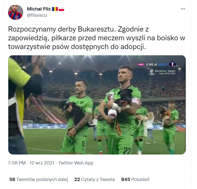 Przy okazji jednego z najważniejszych starć w lidze rumuńskiej, derbów Bukaresztu (przeciwko sobie kluby FCSB i Dinamo), piłkarze jednej z drużyn postanowili wykonać szlachetny gest, który miał zwrócić uwagę na ważny problem. Sportowcy reprezentujący Dinamo wyszli z szatni w towarzystwie psów, które dotąd nie znalazły swoich właścicieli. W ten sposób piłkarze przypominają o potrzebie adoptowania zwierząt, które już wiele w życiu wycierpiały i teraz szukają swoich domów.