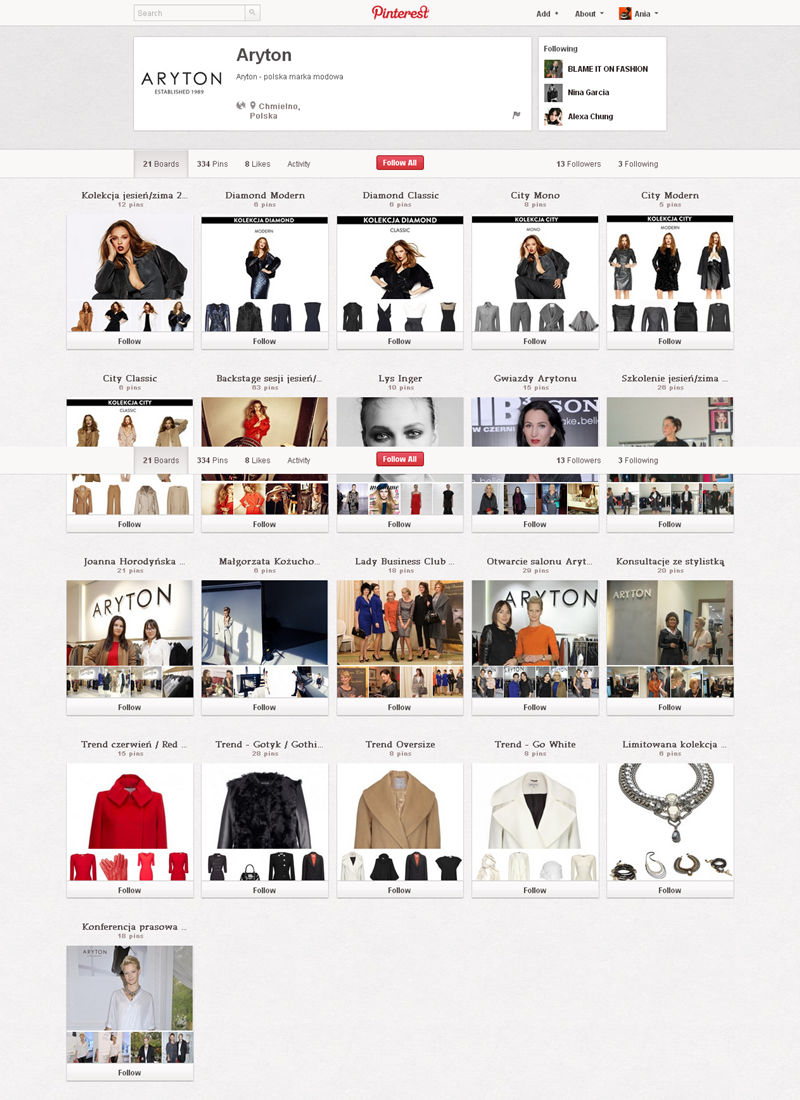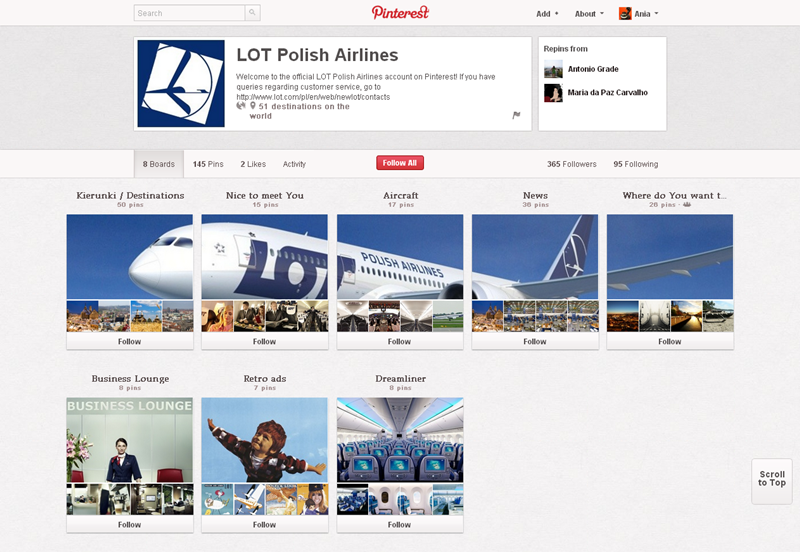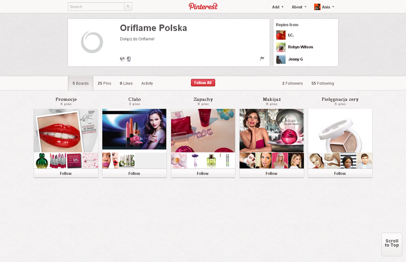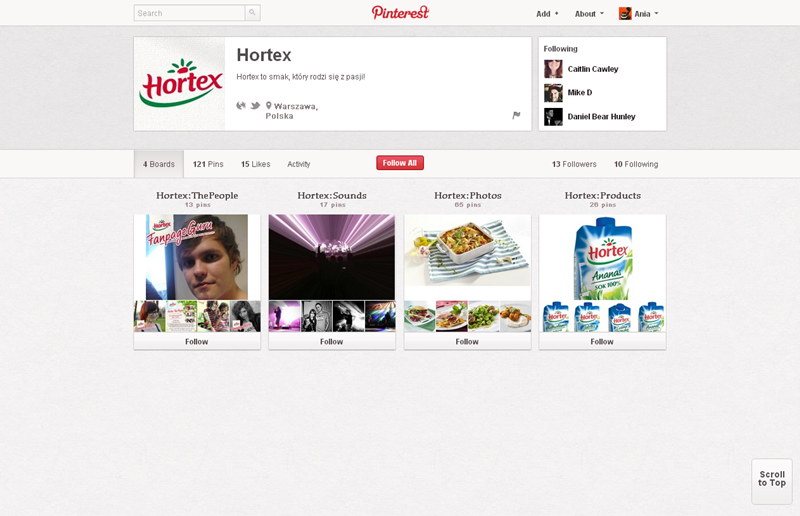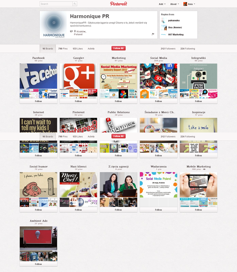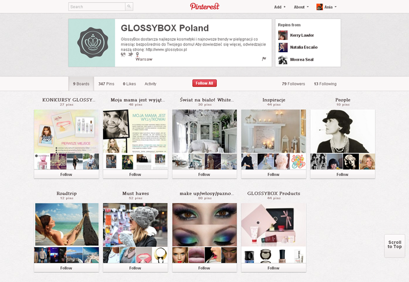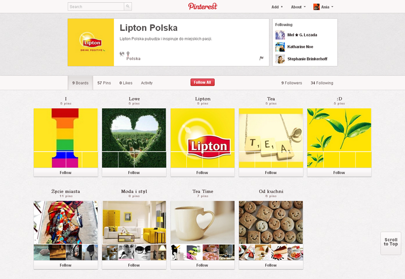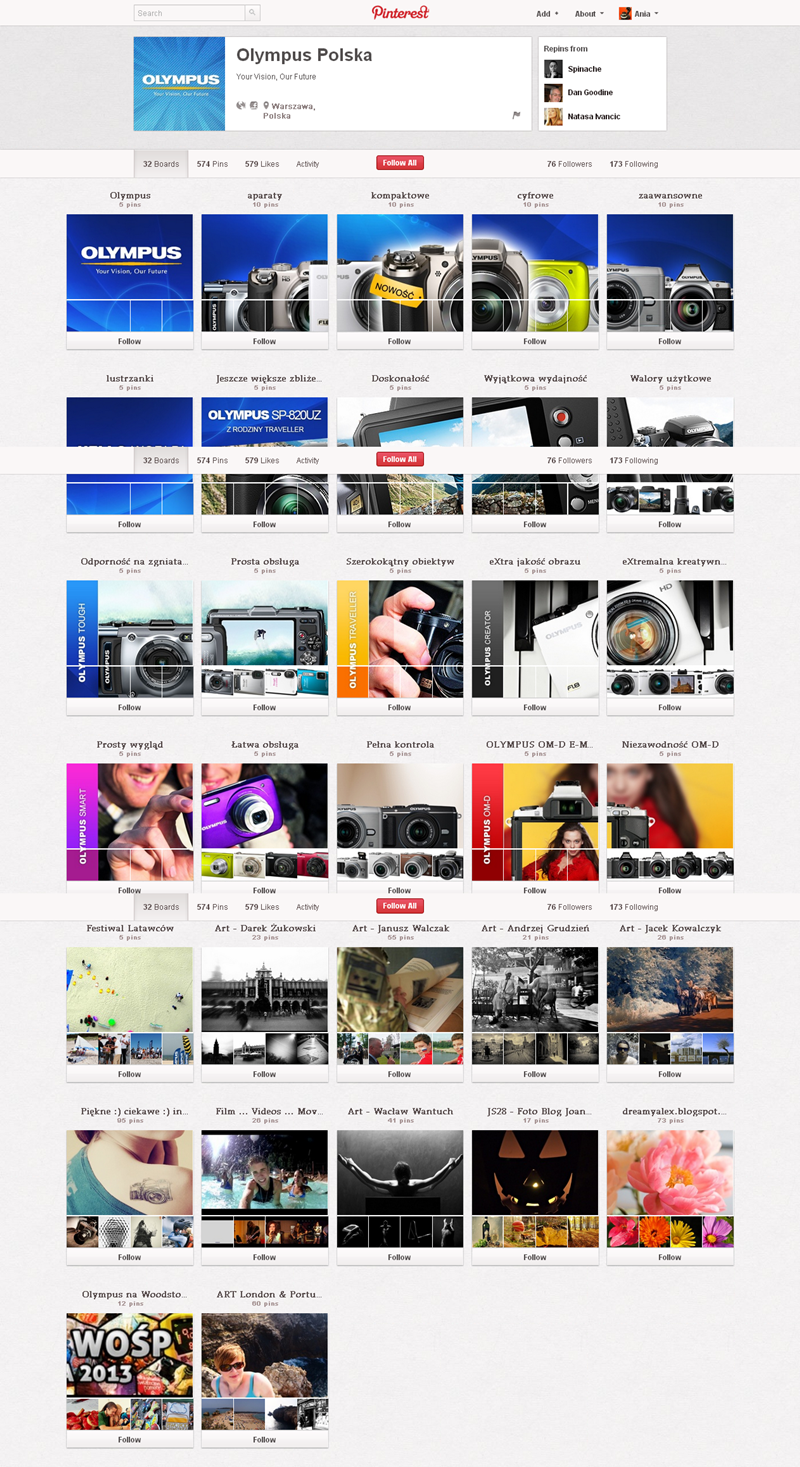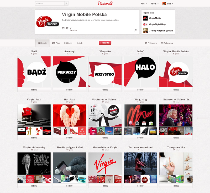 Na Pintereście znaleźć można jeszcze także m.in.: The Body Shop Polska (240 obserwujących), EMI Music PolandGorenje PolskaOlympus PolskaPioneer Polska (172), Toyota PolskaVirgin Mobile, Browar Amber, Rosenthal Polska, Piotr i Paweł, nowy mBank, Castorama Polska, Empik, Lipton Polska i TicTac Polska.