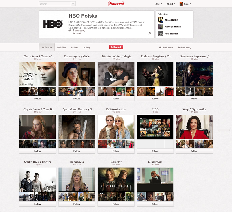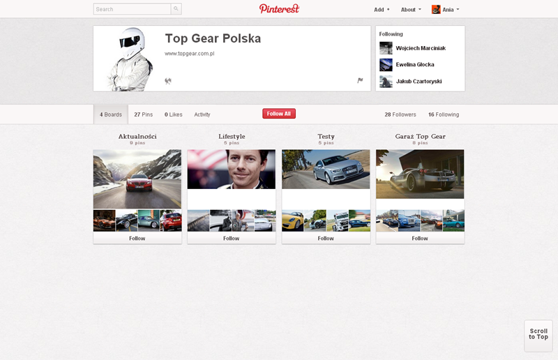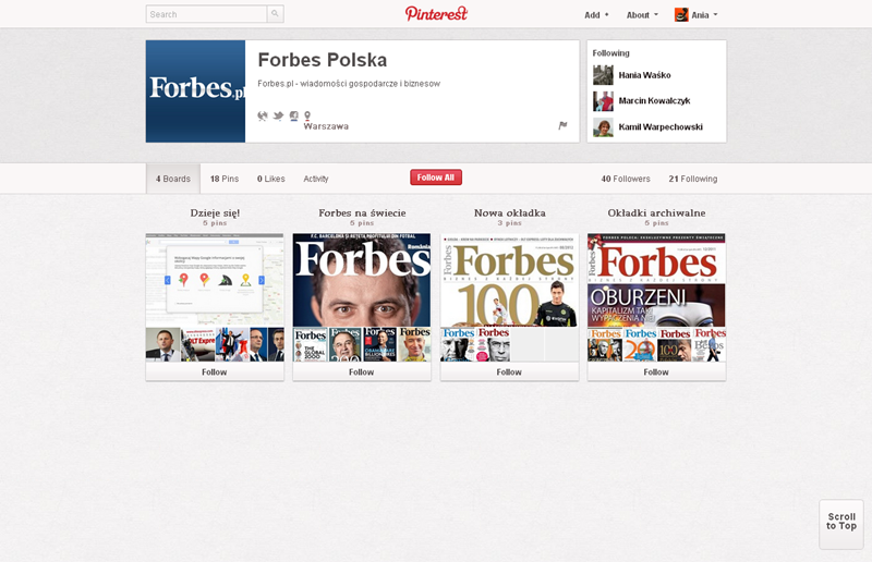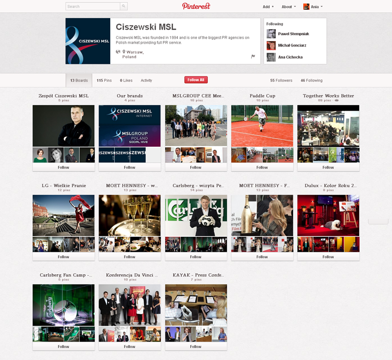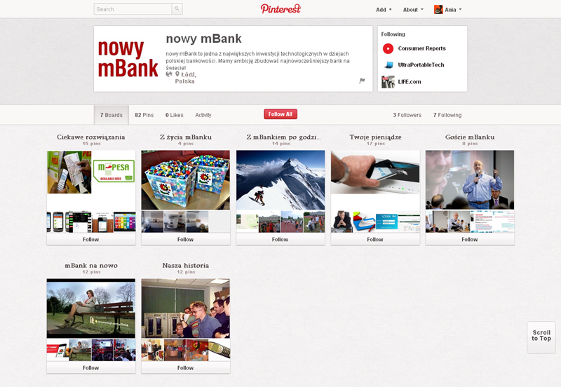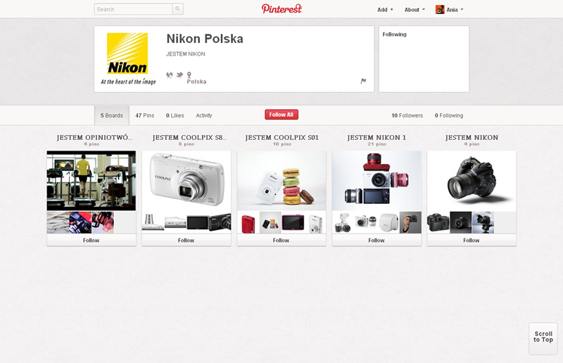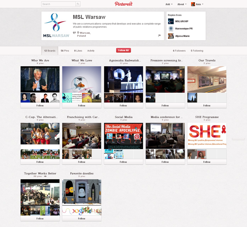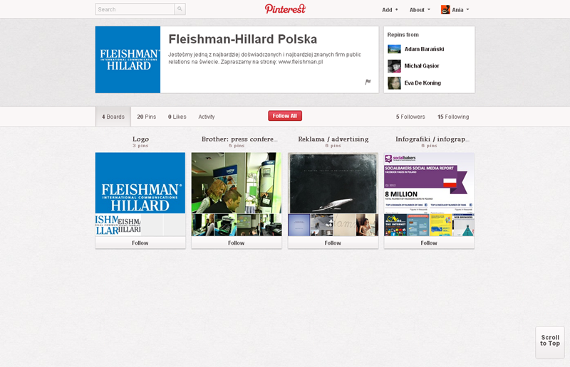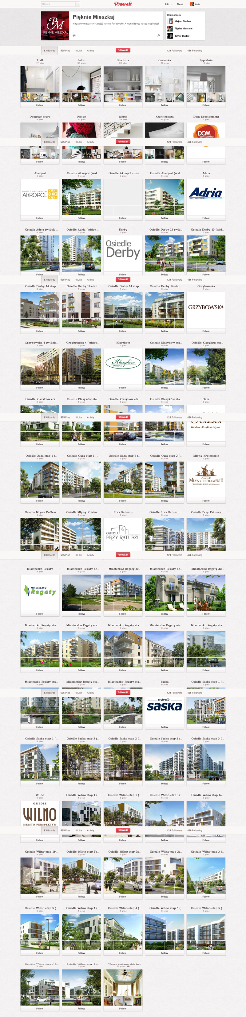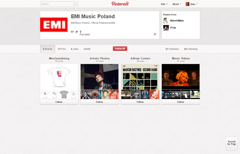 Na Pintereście znaleźć można jeszcze także m.in.: The Body Shop Polska (240 obserwujących), EMI Music PolandGorenje PolskaOlympus PolskaPioneer Polska (172), Toyota PolskaVirgin Mobile, Browar Amber, Rosenthal Polska, Piotr i Paweł, nowy mBank, Castorama Polska, Empik, Lipton Polska i TicTac Polska.