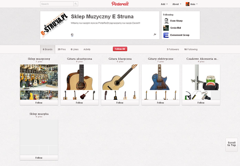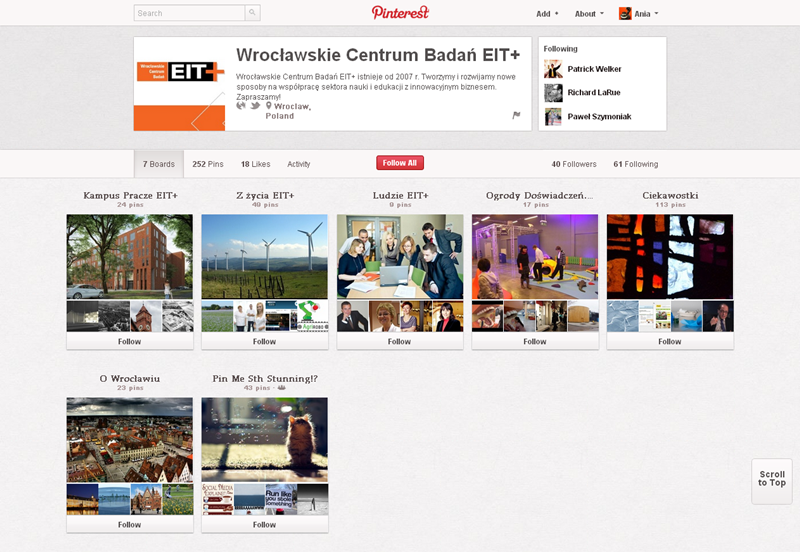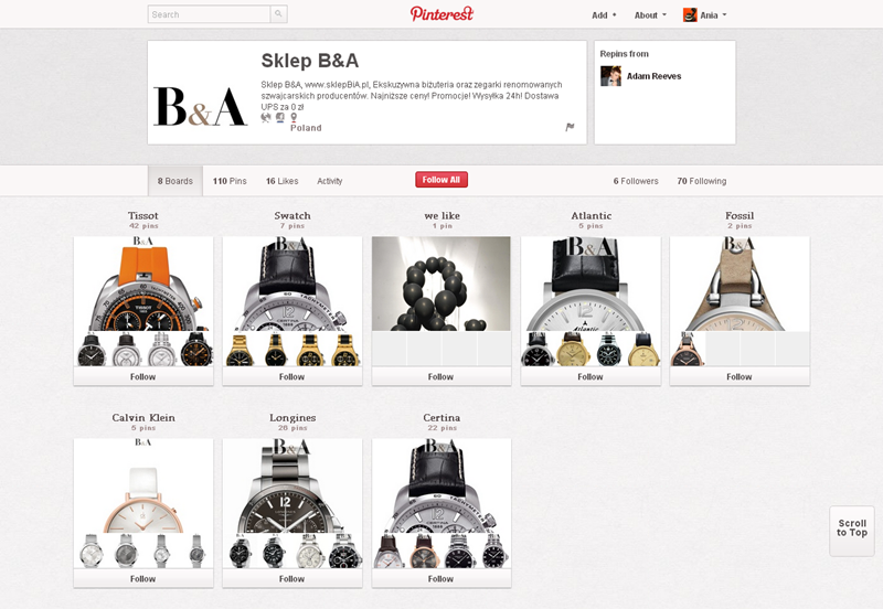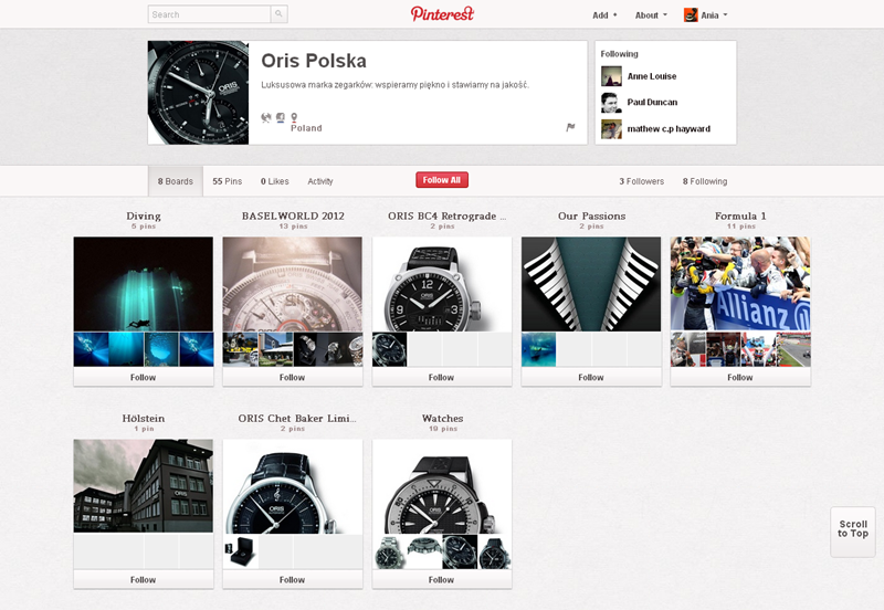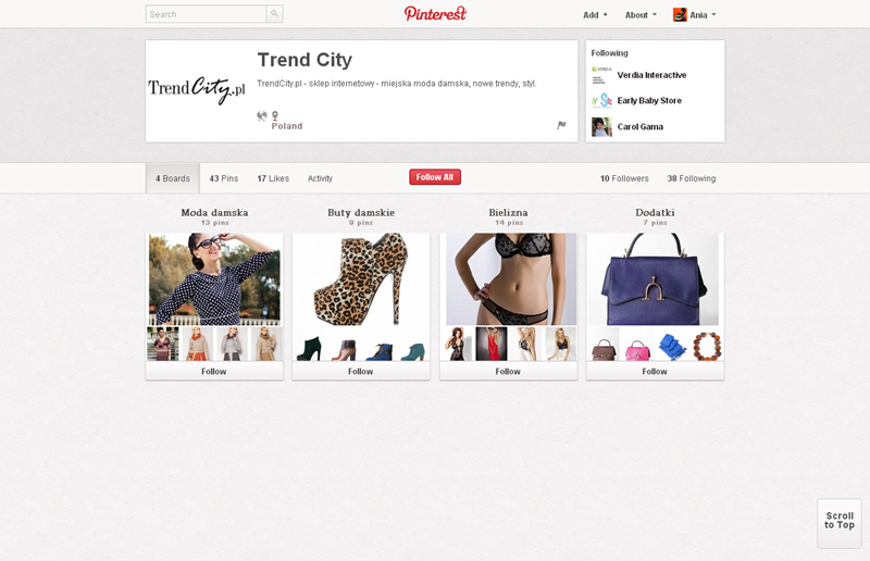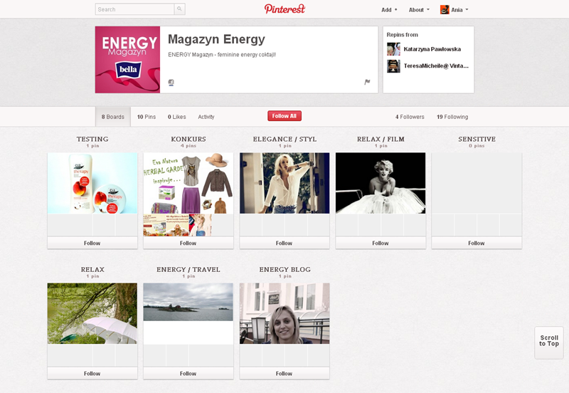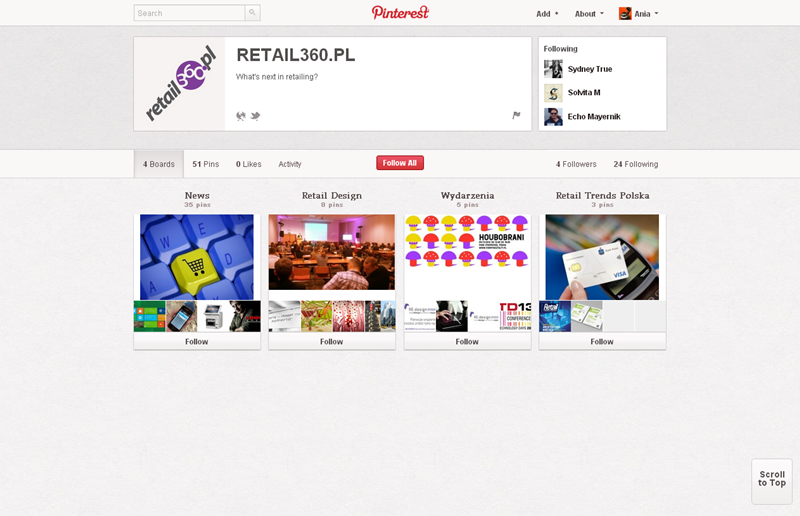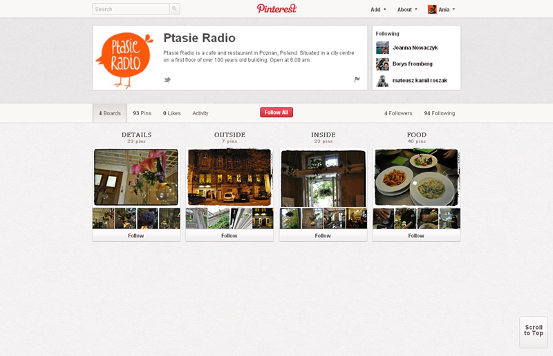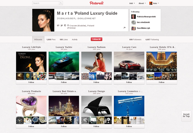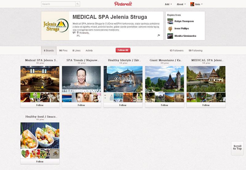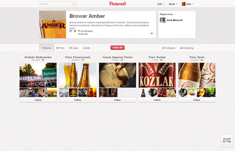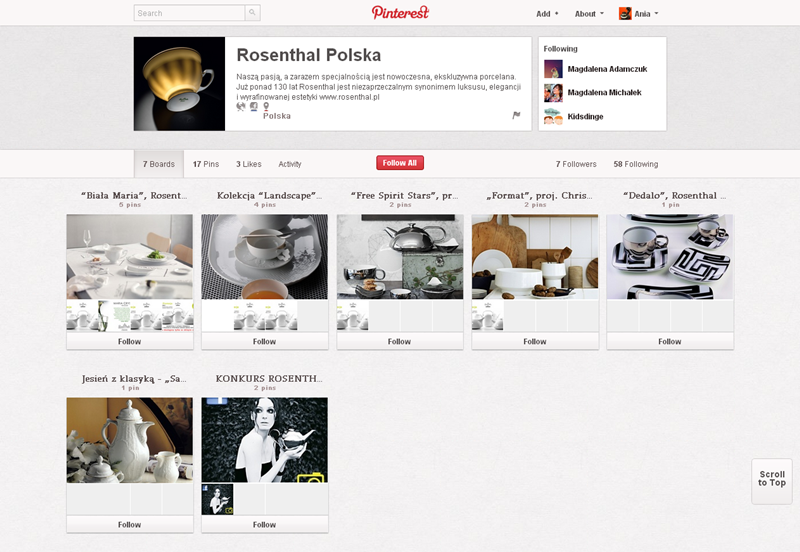 Na Pintereście znaleźć można jeszcze także m.in.: The Body Shop Polska (240 obserwujących), EMI Music PolandGorenje PolskaOlympus PolskaPioneer Polska (172), Toyota PolskaVirgin Mobile, Browar Amber, Rosenthal Polska, Piotr i Paweł, nowy mBank, Castorama Polska, Empik, Lipton Polska i TicTac Polska.