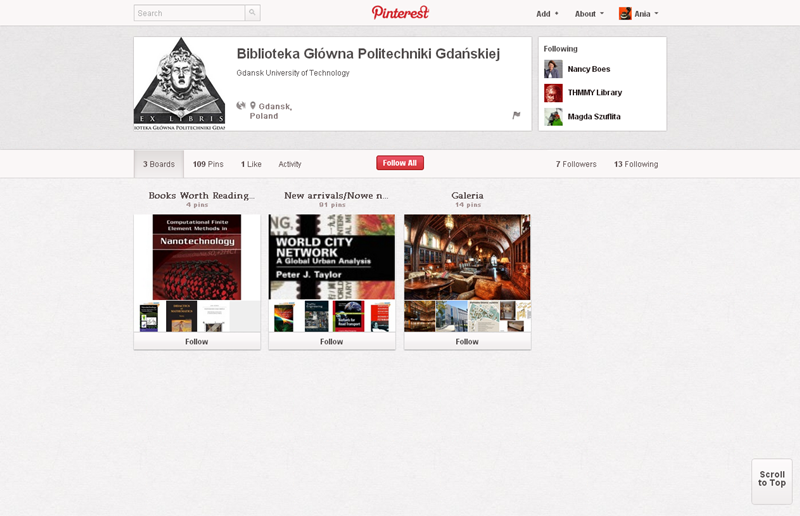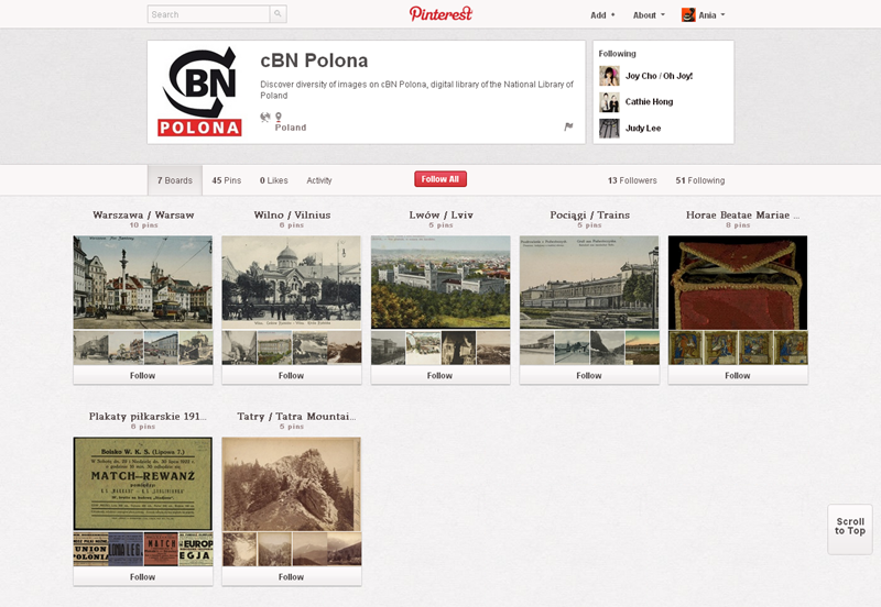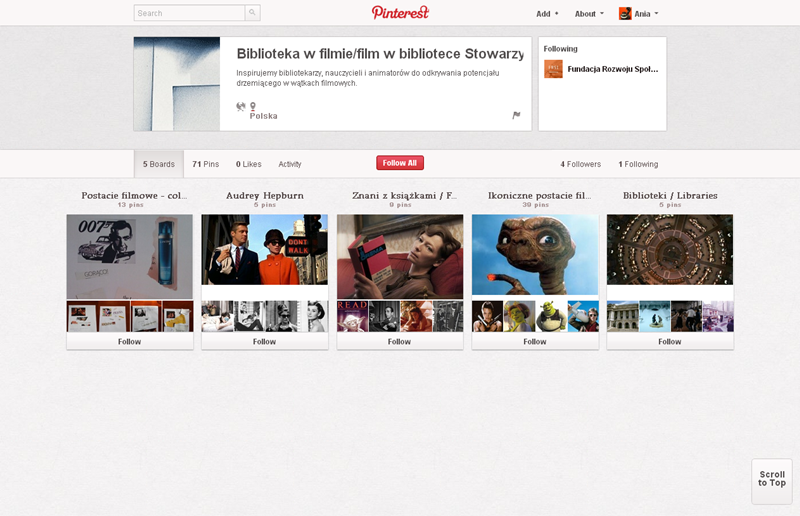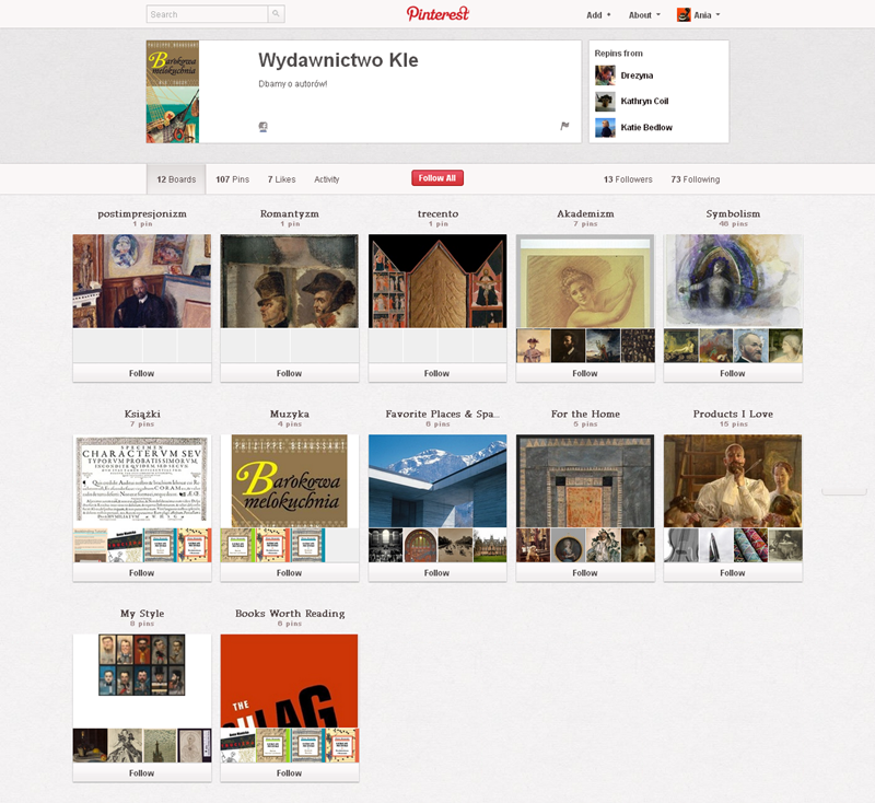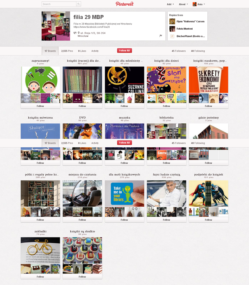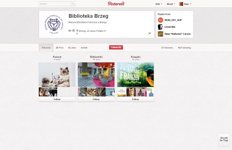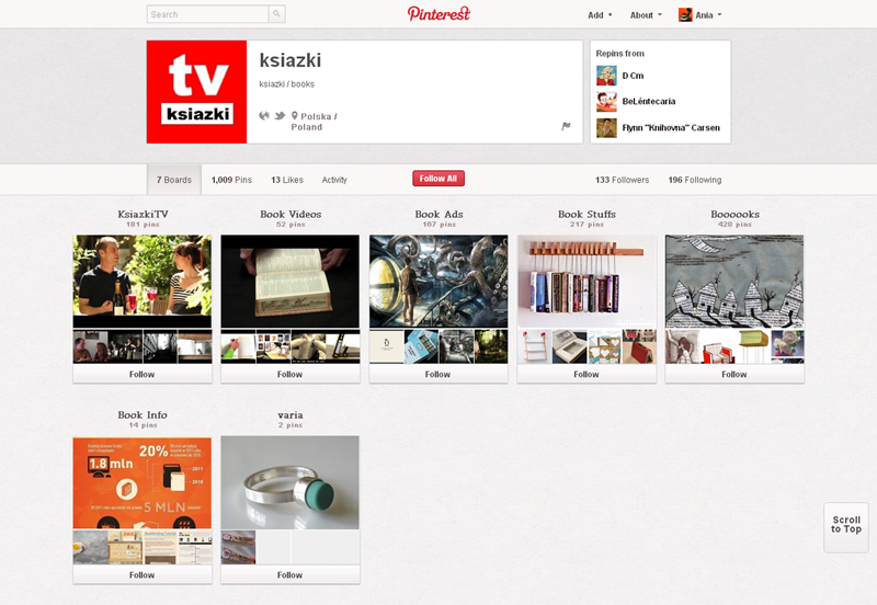 Spośród serwisów związanych z czytaniem na Pintereście najbardziej aktywne są: Booklikes (216 followersów), Książki TV,  Księgarnia Kumiko.pl i Filia nr 29 Miejskiej Biblioteki Publicznej we Wrocławiu.