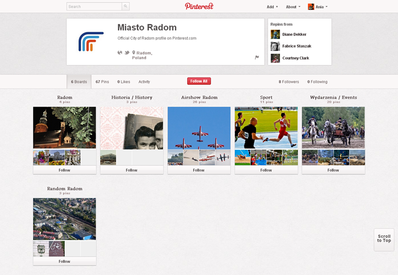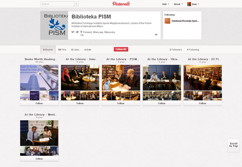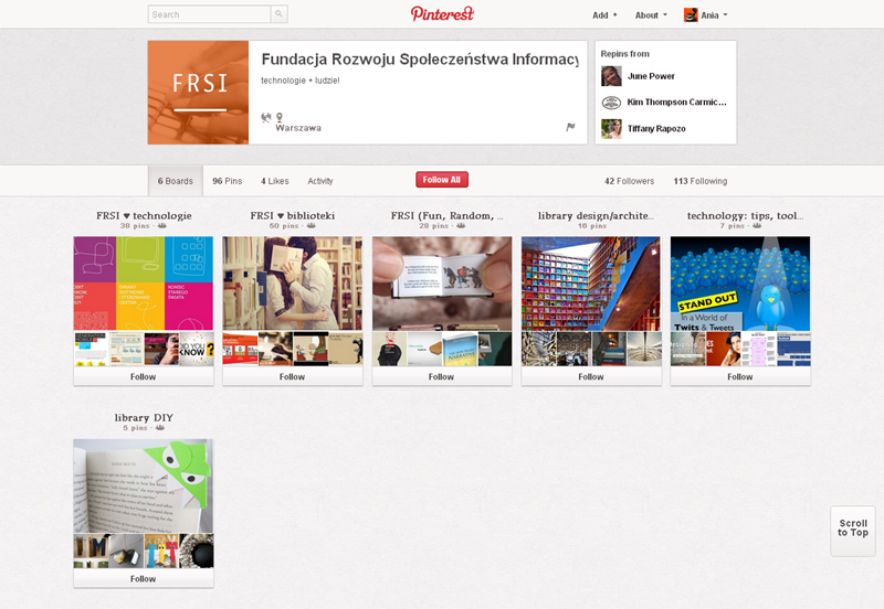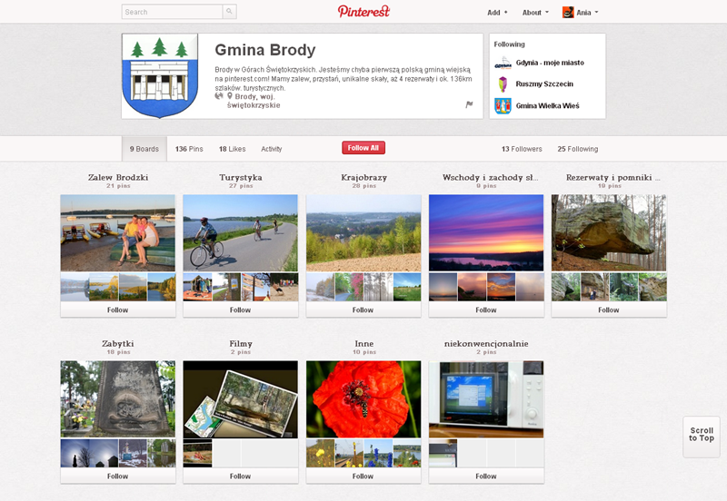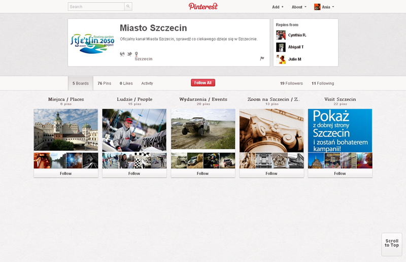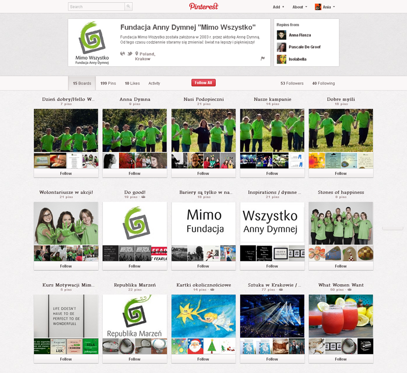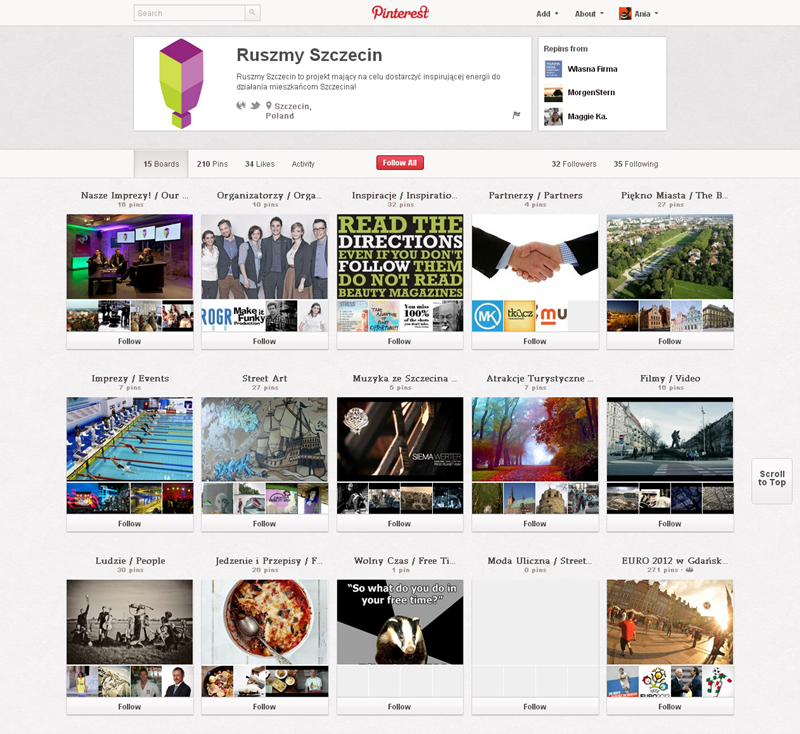 Najaktywniejsze fundacje, kluby, inicjatywy, związki i stowarzyszenia obecne na Pintereście to: Modraszek Kolektyw (161 obserwujących), Klub Miłośników Czystego Obuwia (147) oraz CHI PolskaFundacja Anny Dymnej „Mimo Wszystko”Fundacja Rozwoju Społeczeństwa Informacyjnego oraz Ruszmy Szczecin.