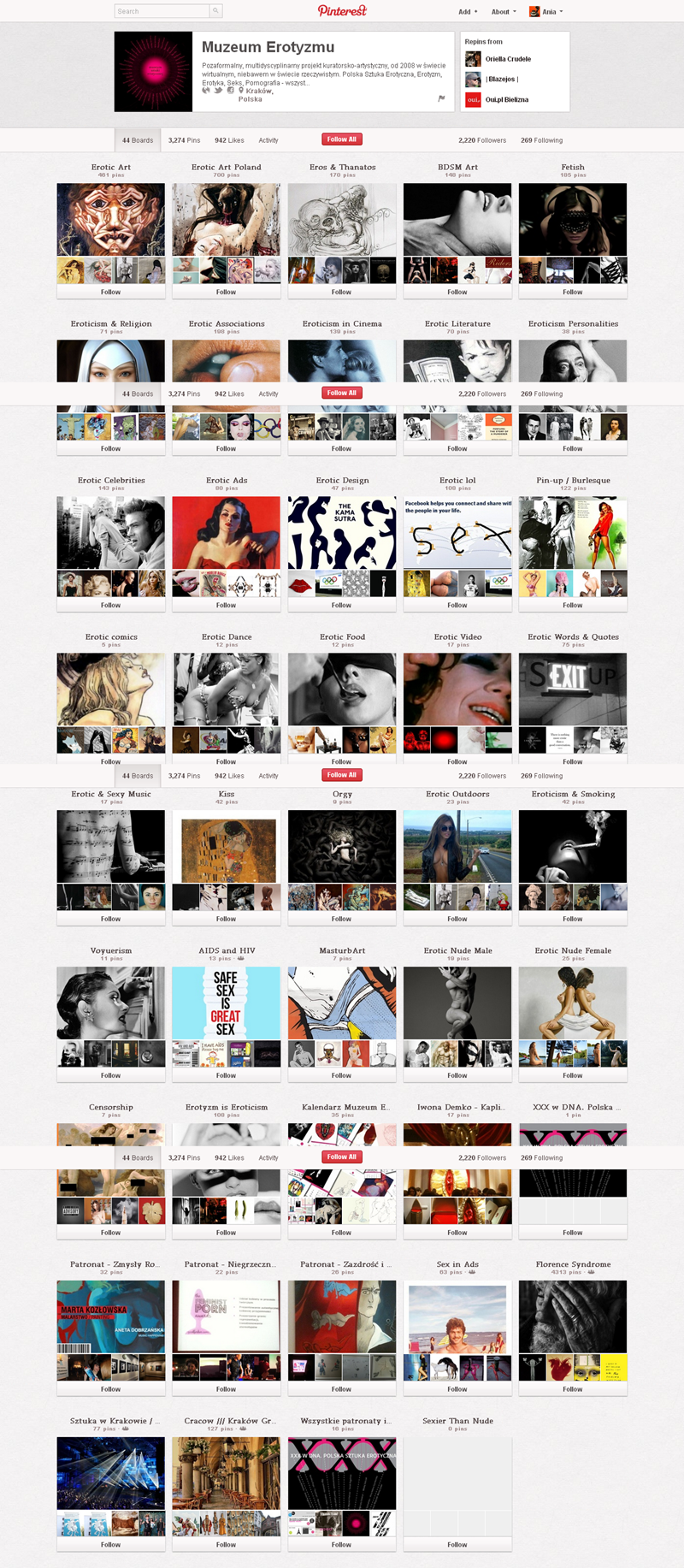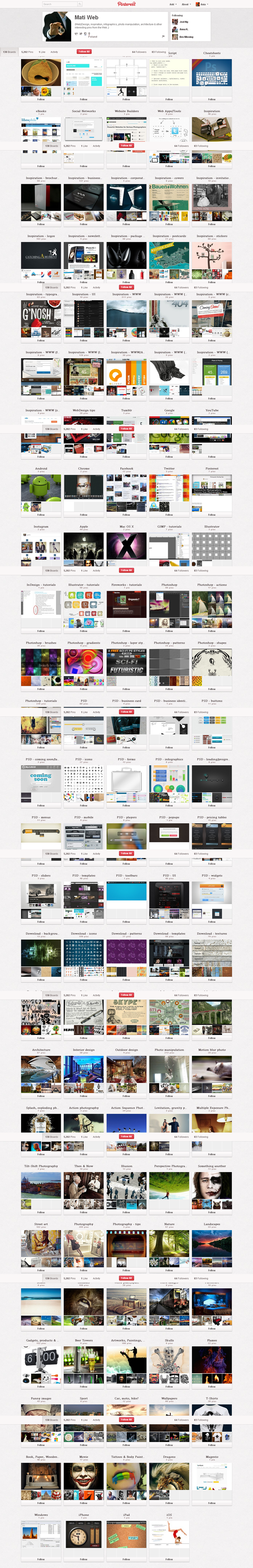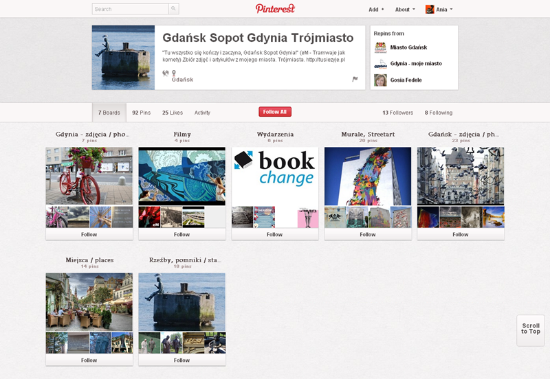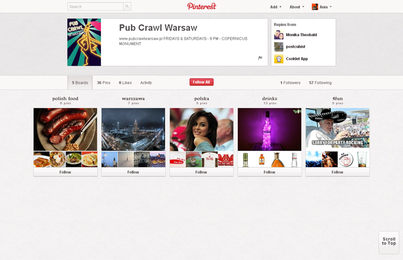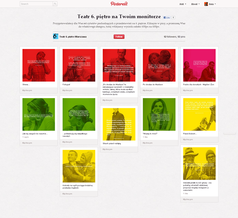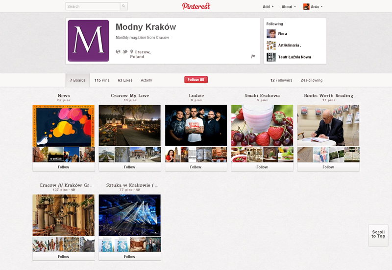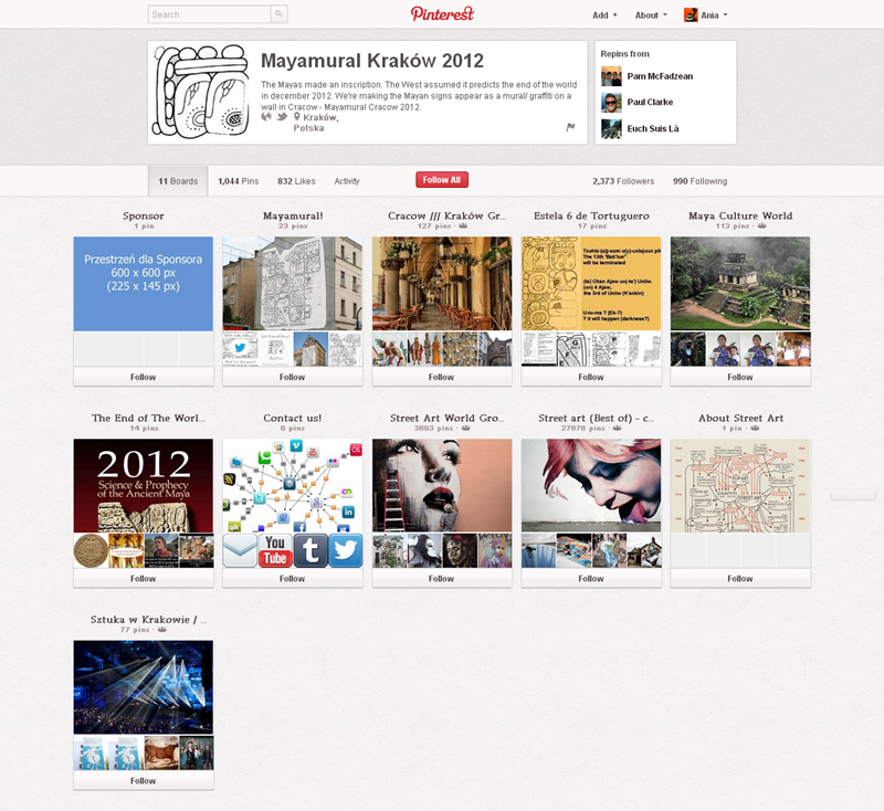 Najpopularniejszym polskim kontem na Pintereście jest strona projektu Mayamural Kraków 2012, którego aktywność śledzi ponad 2300 osób. Swoją działalność kulturalno-rozrywkową starają się promować w tym serwisie także m.in. Muzeum Erotyzmu (2220), Teatr OchotyTeatr Łaźnia Nowa (130), Łódź Design Festiwal i Salsa Libre.