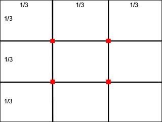 2. 4 mocne punkty zainteresowania – to druga z metod podziału proporcji oraz komunikatów w projekcie. 4 mocne punkty to miejsca, w których przecinają się 4 linie dzielące obszar projektu na równe części. Punkty też najmocniej oddziałują i przyciągają uwagę odbiorcy. To na nie patrzy w pierwszej kolejności, dlatego tam właśnie powinniśmy umieszczać obraz czy komunikaty, na których przekazaniu zależy nam najbardziej. Jak ze wszystkim i tutaj przesada nie jest wskazana – wykorzystujmy maksymalnie dwa punkty, aby nasz projekt nie był przeładowany, odbiorca mógł się na nim właściwie, czyli tak jak chcemy, skupić.