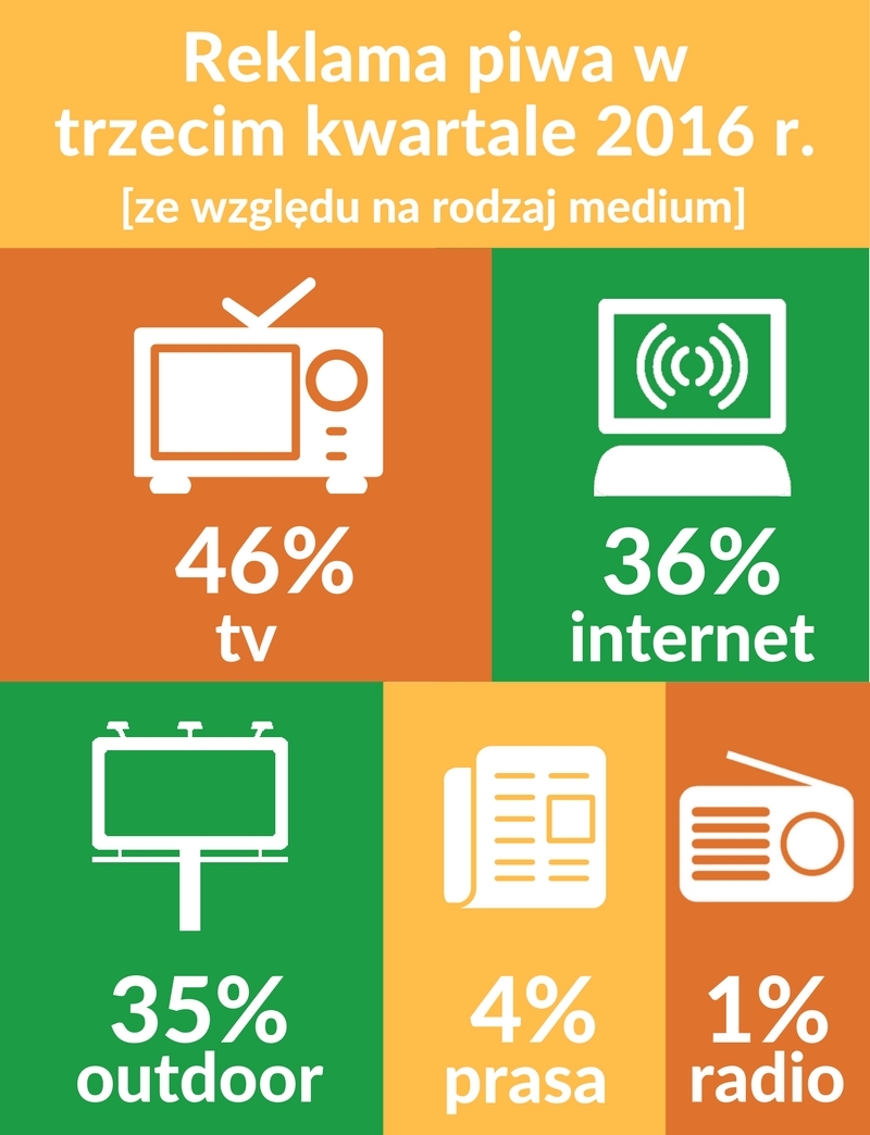 W szczycie sezonu browarnicy swoją reklamową aktywność skoncentrowali na kampaniach telewizyjnych. W formie spotów telewizyjnych ukazała się prawie połowa (46 proc.) wszystkich przekazów. Sporo niżej w reklamowym rankingu mediów uplasował się internet (25 proc. przekazów) oraz outdoor (24 proc. przekazów). W analizowanym okresie z reklamami piwa najrzadziej zetknęli się czytelnicy prasy (4 proc. przekazów) i słuchacze radia (1 proc. przekazów).