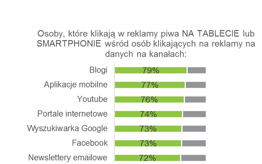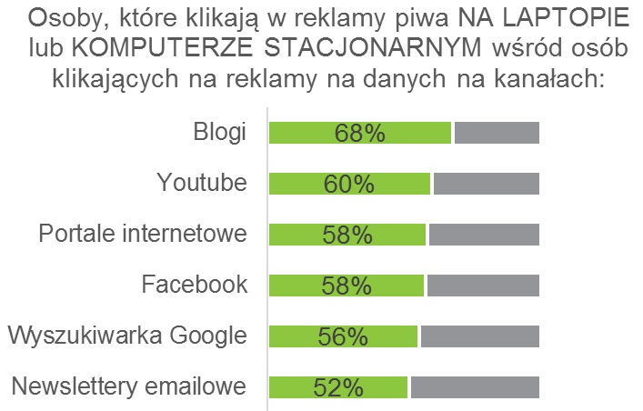 - Osoby aktywne w Internecie, klikające na piwne reklamy display, korzystają najczęściej z YouTube i Facebooka, a zdecydowanie częściej od pozostałych Internautów z Twittera (60%) i Instagrama (52%)
