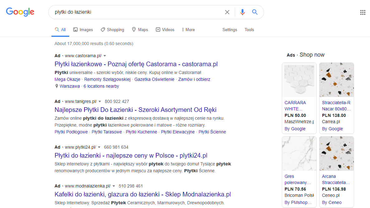 Google Ads oferuje również kampanie inteligentne, które na podstawie danych zebranych na koncie reklamowym Google Ads i uczenia maszynowego Google docierają do odbiorców na ostatnim etapie lejka zakupowego, najbardziej gotowych do skonwertowania na Twojej stronie. Sklepy internetowe mają dodatkowe potężne narzędzia reklamowe od Google. Jedno to kampanie produktowe, czyli reklamy tworzone na podstawie feeda produktowego z Google Merchant Center. Reklamy produktowe wyświetlają się w wynikach wyszukiwania Google w formie grafiki z ceną, nazwą produktu i sklepu oraz odsyłają użytkowników do strony danego produktu w Twoim sklepie. Kolejne to remarketing dynamiczny, który pozwala wyświetlać użytkownikom przeglądającym strony internetowe w sieci reklamowej Google reklamy produktów, które oglądali wcześniej na Twojej stronie.