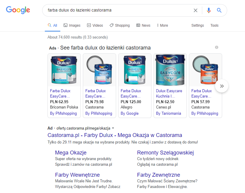 Google Ads oferuje skuteczne możliwości dotarcia do użytkowników w fazie „DO”. Do dyspozycji mamy reklamy w wyszukiwarce na słowa brandowe takie jak „sklep budowlany castorama”, „farba dulux do łazienki castorama”. Sprytnym sposobem na zwiększenie skuteczności komunikacji jest dodanie do wyszukiwanych słów brandowych i produktowych nazwy miasta, np. „castorama warszawa”, „farby do łazienki castorma warszawa” lub zwrotów typu „online” czy „dostawa do domu”. Niezwykle skuteczny będzie tutaj też remarketing, czyli reklamy kierowane do odbiorców, którzy już byli na Twojej stronie internetowej, ale np. nie wykonali kluczowej dla Ciebie konwersji.