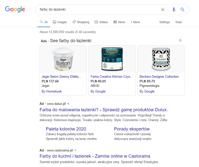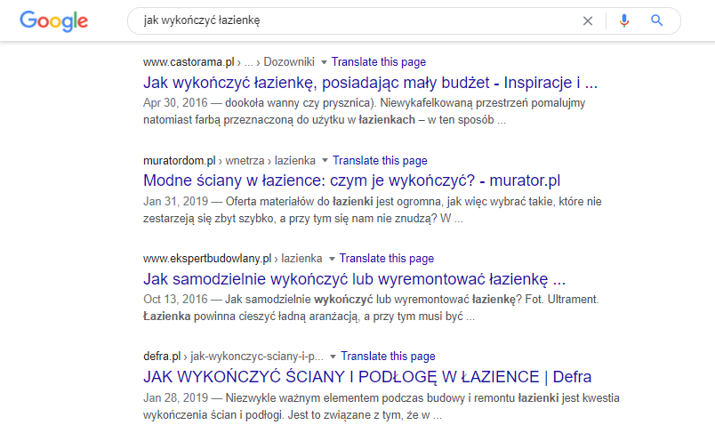 Drugi etap podróży konsumenta to faza „myślenia”. Odbiorców z segmentu „THINK” jest już mniej, gdyż są to osoby bliższe podjęcia decyzji zakupowej. Ci użytkownicy są już bardziej skoncentrowani na wyszukiwaniu informacji. Na tym etapie powinieneś doradzić klientom, w jaki sposób produkt lub usługa taka jak Twoja może im pomóc. Pamiętaj, że klient na drugim etapie swojej podróży poszukuje już bardziej konkretnych i dłuższych słów kluczowych. Zgodnie z wątkiem tematycznym, jaki przyjęłam na początku przykładowej podróży konsumenta, na tym etapie będą to już słowa takie jak „materiały wykończeniowe”, „sklep budowlany”, „wyposażenie łazienek”, „farba do łazienki” itp. To jest odpowiedni moment, by wykorzystać potencjał wyszukiwania fraz związanych z Twoją ofertą, zarówno w SEO, jak i Google Ads. Korzystając z reklam, zwiększysz świadomość marki oraz prawdopodobieństwo, że klient powróci do Twojej witryny. Jednocześnie oferujesz klientowi strony docelowe z informacjami, których szuka.