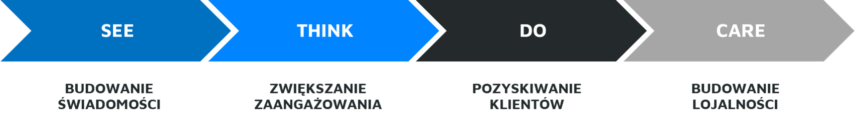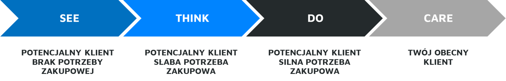 W planowaniu strategii mediowej na początku najważniejsze jest zdefiniowanie, kto jest Twoim potencjalnym klientem. Przydatne jest tutaj tworzenie tzw. person, profili fikcyjnych klientów, do których będziesz kierował Twoją komunikację. Kiedy tworzysz treści dla konkretnego odbiorcy spośród docelowych odbiorców, Twój przekaz będzie skuteczniejszy. Jednak znacznie lepsze wyniki można osiągnąć, ucząc się rozpoznawać każdy etap cyklu zakupowego klienta. I właśnie w tym pomaga model SEE-THINK-DO-CARE.