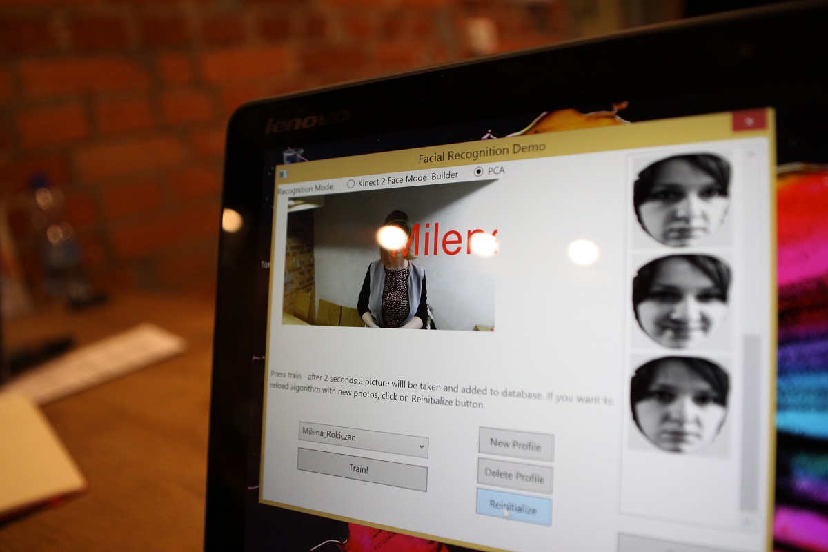 - system rozpoznawania klienta (umożliwiający jego identyfikację za pomocą dwóch niezależnych rozwiązań – w oparciu o algorytm porównujący obraz twarzy zarejestrowany za pomocą urządzenia Kinect z cechami obrazów wzorcowych znajdujących się w bazie oraz jego alternatywę w postaci karty RFID wykorzystującej fale radiowe),