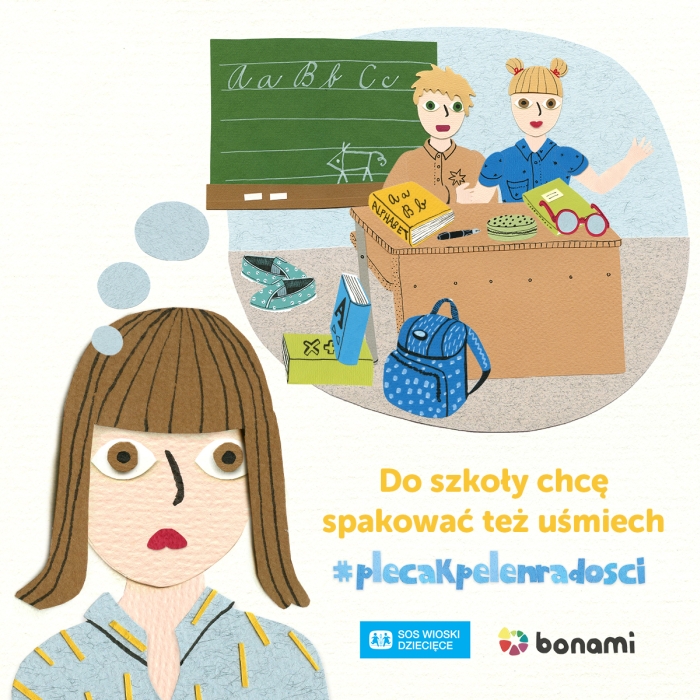 Chcąc wspomóc działalność Stowarzyszenia SOS Wioski Dziecięce, sklep internetowy Bonami.pl przyłączył się do akcji „Problemy dorosłych to ciężar dla dzieci”. Kupując symboliczne produkty szkolne dostępne w specjalnej kampanii sklepu, możemy pomóc potrzebującym dzieciom odciążyć ich plecak pełen trudnych doświadczeń i wyrównać edukacyjne szanse. Kampania „Plecak pełen radości” dostępna będzie od 1 sierpnia do 1 września. Dodając do koszyka w sklepie internetowym Bonami.pl wirtualne wyposażenie szkolnego plecaka, pomożemy potrzebującym dzieciom otrzymać tak potrzebne w ich sytuacji życiowej wsparcie. Akcja jest wspierana w mediach społecznościowych hashtagiem #plecakpelenradosci. Wszystkie zebrane środki zostaną przekazane na rzecz działalności Stowarzyszenia SOS Wioski Dziecięce, które wspiera opuszczone i osierocone dzieci oraz te, które zmagają się z trudną sytuacją życiową.