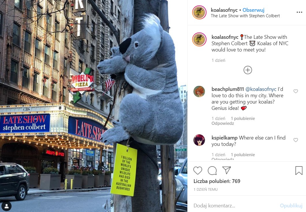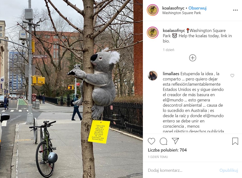 W związku z tym, wiele organizacji społecznych, marek czy też osobistości medialnych organizuje różnorodne akcje, których celem jest m.in. zbiórka pieniędzy na pomoc poszkodowanych zwierzętom. Jedną z nich jest inicjatywa „Koalas of NYC” australijskiej agencji kreatywnej Cummins&Partners.