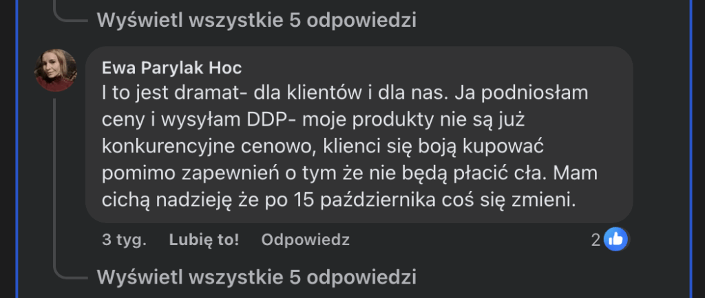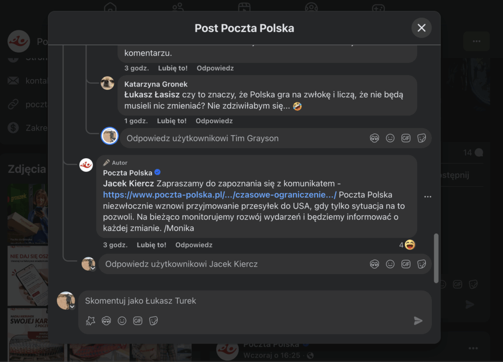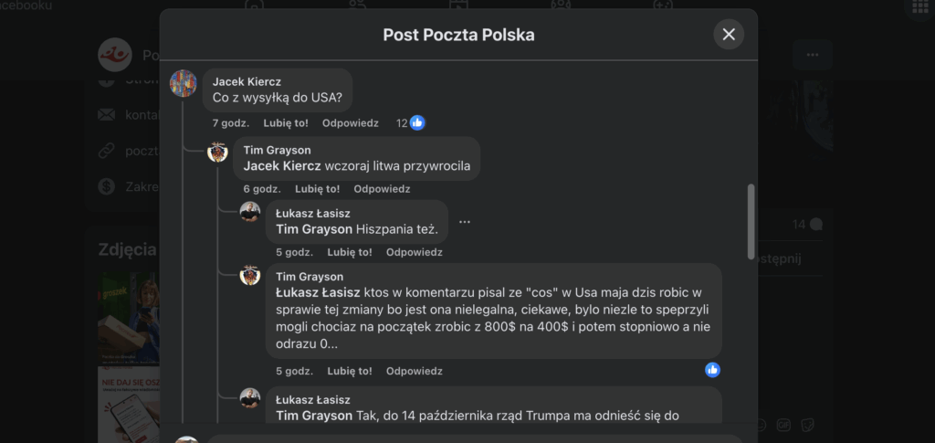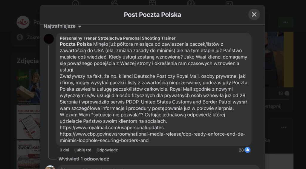 Przedsiębiorcy współpracujący z amerykańskim rynkiem narzekają, że w obecnej sytuacji za kilka tygodni będą zmuszeni zawiesić działalność. Wszystko przez brak jakiejkolwiek informacji ze strony Poczty Polskiej. Ponadto otrzymaliśmy sygnały, według których Poczta nie tylko nie reaguje na pytania internautów, ale także usuwa ich komentarze spod postów publikowanych w ostatnich miesiącach.