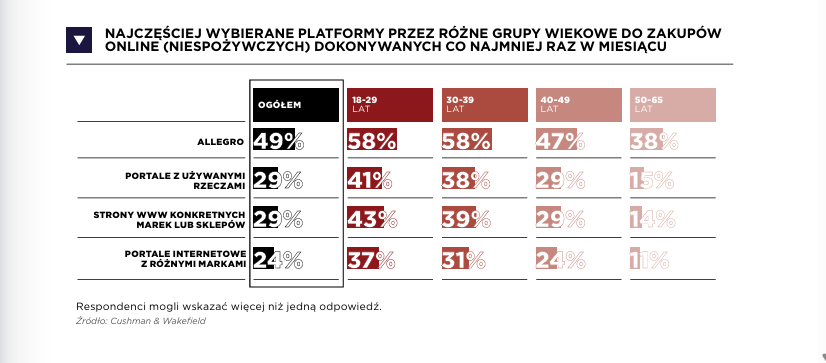 Wśród najczęściej wybieranych platform e-commerce znalazły się: Allegro, portale z towarami z drugiej ręki oraz strony internetowe konkretnych, preferowanych przez konsumentów, sklepów i marek.