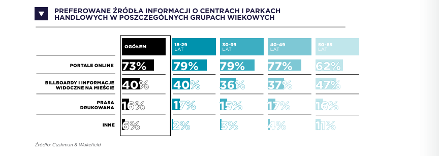 Cushman & Wakefield podkreśla też, że to właśnie pokolenie 40+ stanowi dziś rdzeń klasy średniej, która napędza rozwój retailu i wpływa na strategie zakupowe młodszych generacji. Co więcej, autorzy raportu przeanalizowali również preferowane przez ankietowanych źródła informacji na temat centrów i parków handlowych. Okazuje się, że we wszystkich grupach wiekowych prym wiodą portale online, a na drugim miejscu znajdują się billboardy i informacje widoczne w mieście.