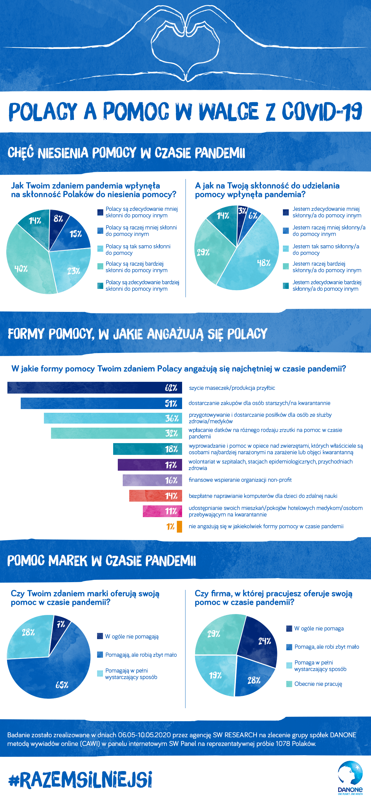 Z badania SW Research na zlecenie spółek DANONE wynika, że w opinii ponad połowy ankietowanych pandemia zwiększyła skłonność Polaków do niesienia pomocy. Respondenci upatrują dwóch głównych przyczyn zmiany postaw. Blisko 50% badanych zgodziło się, że trudna sytuacja spowodowana pandemią jednoczy i solidaryzuje ludzi. Natomiast według 46% respondentów na naszą gotowość do niesienia pomocy wpływa świadomość, że choroba COVID-19 wywołana koronawirusem może dotknąć bez wyjątku każdego z nas.