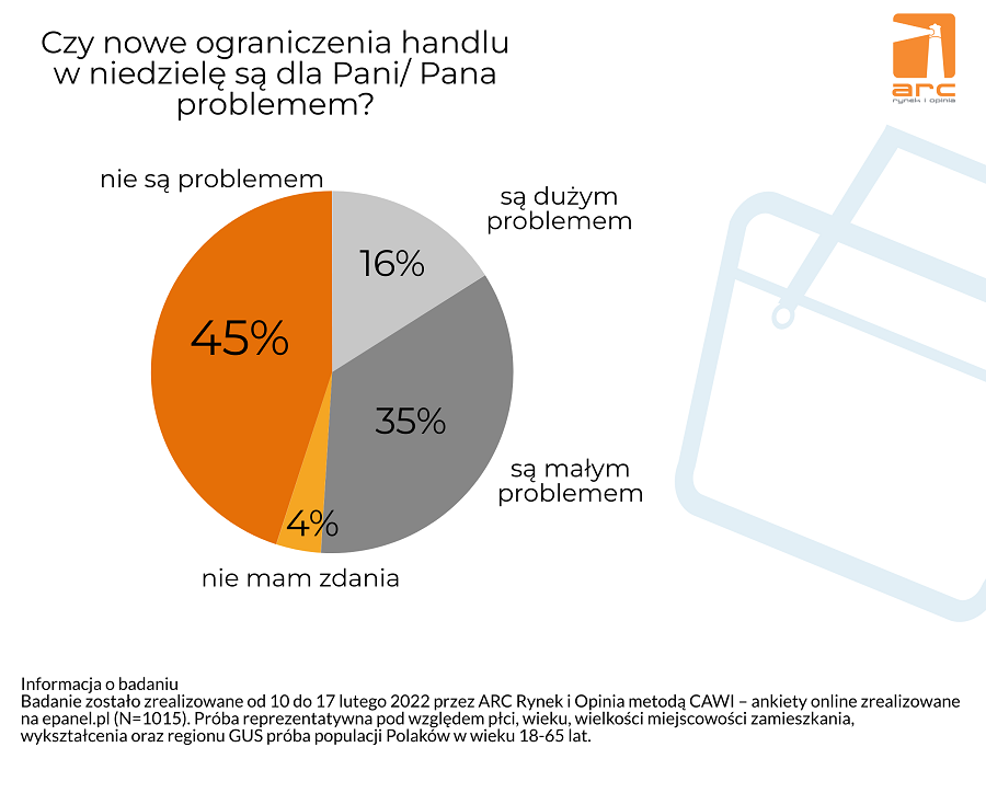 Połowa badanych Polaków (51%) przyznaje, że najnowsze obostrzenia dotyczące zakazu handlu w niedzielę stanowią dla nich problem. Wśród nich przeważają ludzie młodzi (18-24 lat) – 68% oraz mieszkańcy największych miast (powyżej 500 tys.) – 62%.