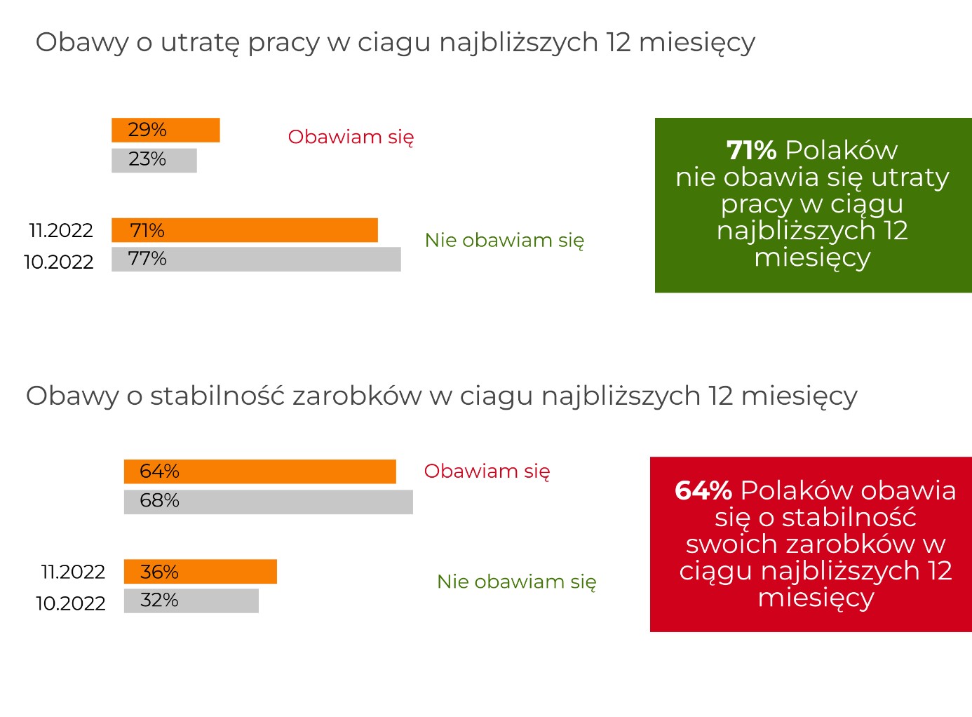 Z kolei w porównaniu z wynikami z października nieco (o 4 p.p.) spadł odsetek osób obawiających się o stabilność swoich zarobków. Obecnie 64% badanych ma takie obawy