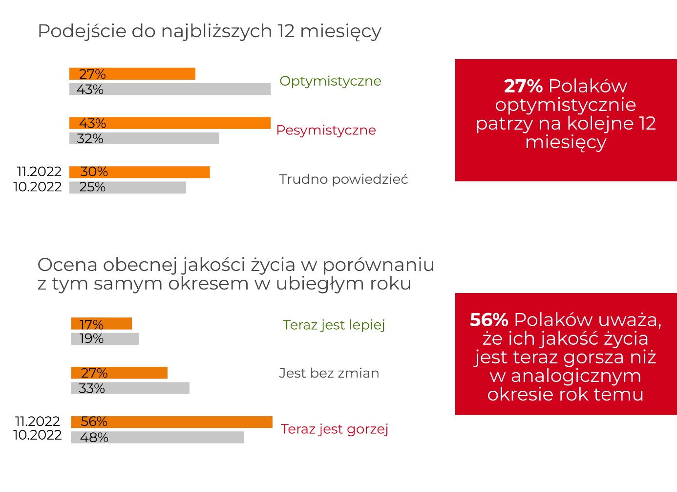 Wyższy odsetek osób (56% versus 48% w październiku) uważa, że żyje im się obecnie gorzej niż w analogicznym okresie ubiegłego roku.