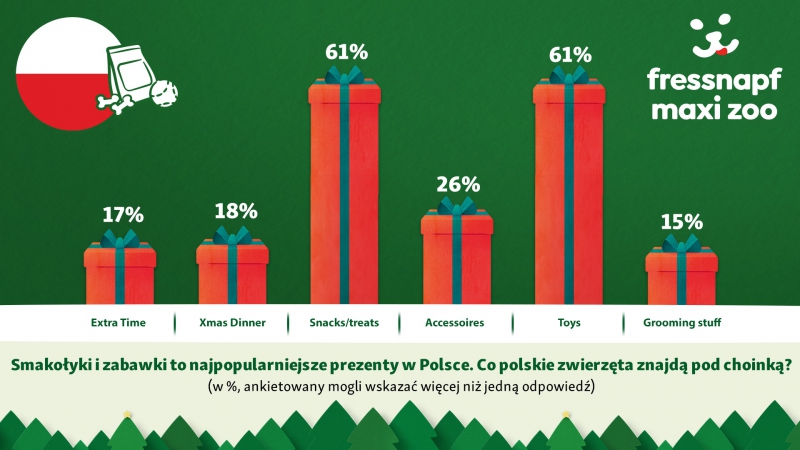 W Polsce najpopularniejsze prezenty to smakołyki i zabawki. Oba typy produktów wybiera po 61% opiekunów zwierząt. Kolejne miejsca zajmują akcesoria i artykuły do pielęgnacji, lecz ankietowani deklarowali także, że spędzą ze swoimi pupilami więcej czasu lub przygotują dla nich świąteczny posiłek. Wyniki są bardzo podobne w zachodniej Europie, tutaj także to dwie najpopularniejsze kategorie. Delikatnie różnią się jednak najchętniej wybierane wskazania: w Niemczech wygrywają przekąski (70%), a we Francji na pierwszym miejscu są zabawki (66%).