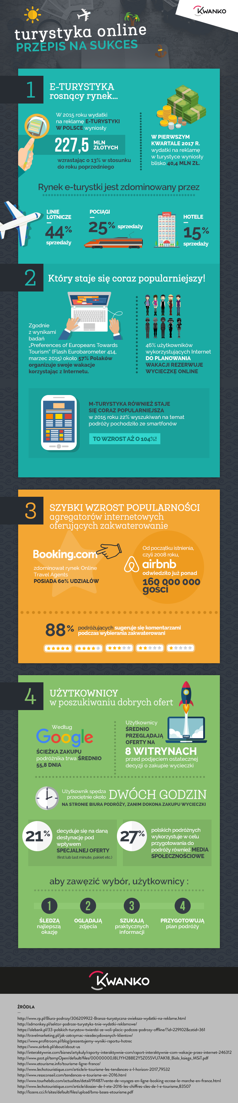Według europejskich badań ponad połowa Polaków korzysta z Internetu organizując swoje wakacje, z czego rezerwacje wycieczek za pomocą sieci dokonuje 46% z nas. W innych krajach europejskich liczby te są jeszcze większe. We Francji w 2016 r. aż 77% użytkowników organizowało swoje wakacje korzystając z Internetu. Odsetek ten rośnie z roku na rok (o 6% w porównaniu do 2015). – Ważnym trendem dla właścicieli przedsiębiorstw działających w sektorze turystycznym jest rosnące znaczenie kanału mobile. W Polsce 22% wyszukiwań na temat podróży pochodziło ze smartfonów. W Europie ten odsetek jest nawet dwa razy większy, więc możemy się spodziewać, że i u nas m-turystyka będzie coraz popularniejsza – komentuje Michał Sołtys, Regional Director Central Eastern Europe w Grupie Kwanko, która specjalizuje się m.in. w reklamie mobile.