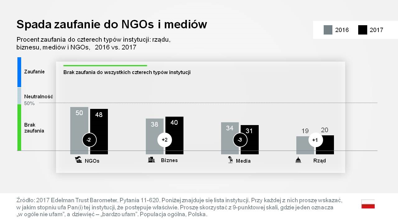 W rankingu zaufania do instytucji ostatnie miejsce zajmuje rząd, któremu skłonnych jest zaufać 20 proc. Polaków (wzrost o 1 proc. w porównaniu z ubiegłorocznym badaniem). Tradycyjnie najbardziej ufamy organizacjom pozarządowym, choć w porównaniu z ubiegłym rokiem liczba Polaków deklarujących zaufanie do NGOs zmniejszyła się o 2 proc. (z 50 do 48 proc.). Największy spadek zaufania zanotowały media (z 34 do 31 proc.) Rośnie zaufanie do biznesu, któremu jest skłonnych zaufać 40 proc. Polaków (38 proc. w poprzednim badaniu). Drastyczny spadek wiary w działania różnego rodzaju instytucji można zaobserwować w każdej z 28 nacji objętych badaniem ETB.