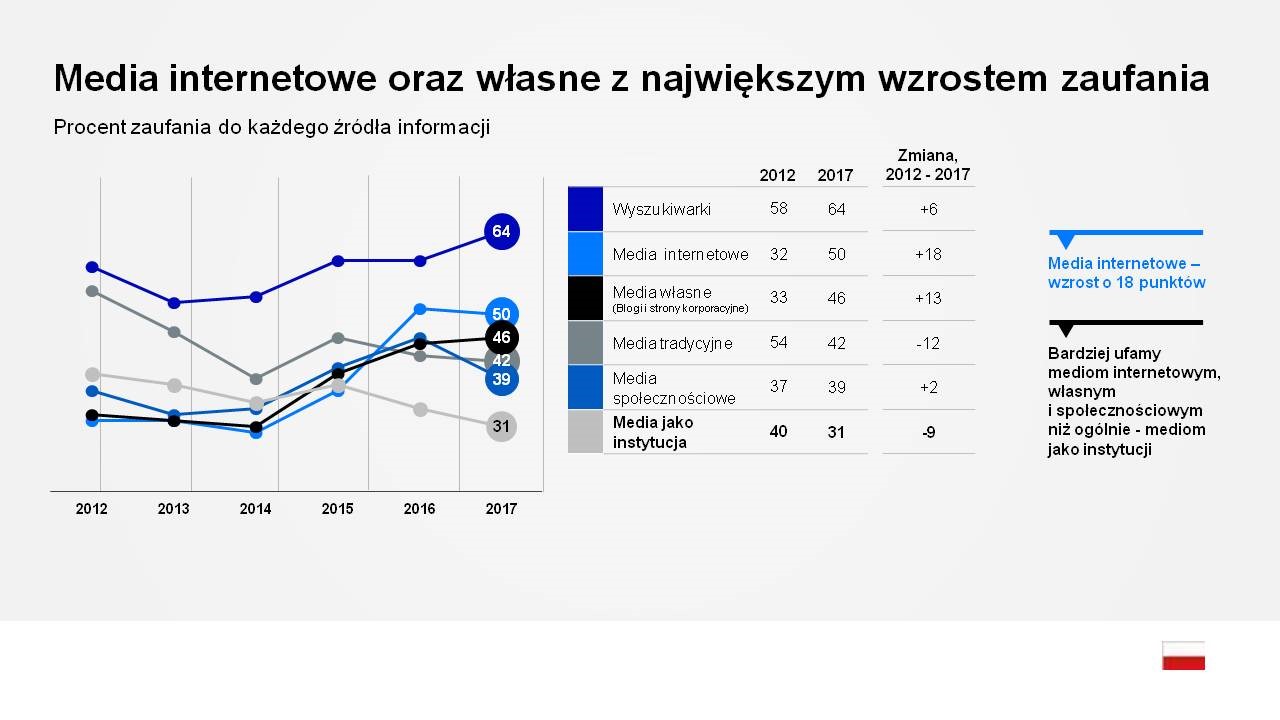 Wszystkie media internetowe (w tym wyszukiwarki, portale, strony www czy media społecznościowe) stają się dla Polaków coraz bardziej wiarygodne. W tym samym czasie zaufanie do mediów tradycyjnych systematycznie spada. 51 proc. Polaków jest skłonnych bardziej zaufać wynikom wyszukiwarek internetowych niż redaktorom z krwi i kości (49 proc.).
