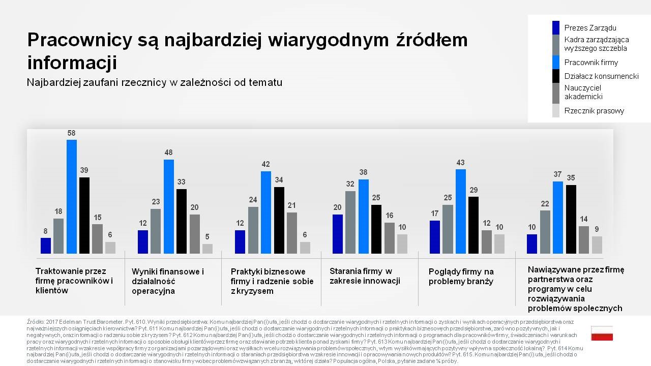 Jeśli chodzi o pozyskiwanie informacji na temat firm i marek, najbardziej ufamy osobom podobnym do nas samych (Indeks Zaufania równy 55 pkt) oraz ekspertom akademickim (52 pkt) i specjalistom (48 pkt). W oczach Polaków najmniej wiarygodni są prezesi firm i urzędnicy (odpowiednio 23 pkt i 18 pkt). Jak w takiej sytuacji powinien odnaleźć się biznes? Jak pokazuje ETB, najbardziej wiarygodnymi ambasadorami firm są zwykli pracownicy. Najmniej ufamy rzecznikom prasowym.