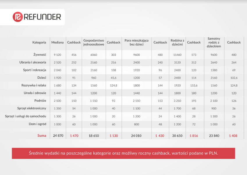 Badanie pokazuje, że Polacy to świadomi konsumenci, którzy planują swoje wydatki oraz szukają nowych sposobów na oszczędzanie pieniędzy. Coraz więcej osób przekonuje się, że wyszukiwanie promocji w Internecie lub przeglądanie gazetek promocyjnych sklepów stacjonarnych, to nie jedyne sposoby na zaoszczędzenie pieniędzy. Z naszych wyliczeń wynika, że dzięki serwisom cashbackowym takich jak Refunder, Polak jest w stanie zaoszczędzić blisko 1500 złotych rocznie. To całkiem pokaźna suma – wyjaśnia Eva-Lotta Wojtasik, Market Analyst & Business Developer w Refunder.pl. Jeszcze więcej może zaoszczędzić rodzina z dziećmi, cashback w tym przypadku przekracza 1800 złotych rocznie. Korzystanie z tego typu serwisów nie wymaga od klientów żadnego dodatkowego wysiłku poza zrobieniem zakupów w sklepach przyłączonych do programu. Dostajemy więc zwrot pieniędzy za zakupy, które i tak byśmy zrobili – podsumowuje Wojtasik.