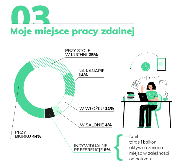 Home office, jak sama nazwa wskazuje, czyni z naszej domowej przestrzeni biuro. A już od samych pracujących zależy, jak je sobie urządzą. W sieci pojawiło się wiele zdjęć pokazujących pracę na deskach do prasowania, czy przeprowadzkowych kartonach. Na pytanie, gdzie najchętniej pracujesz, ankietowani w zdecydowanej większości 44% odpowiedzieli, że przy biurku. 25% świetnie czuje się także przy stole w kuchni, a 14% spędza zarządza projektami z poziomu kanapy. Tylko 11% postanawia zostać w tym czasie w łóżku, a 4% w salonie. Natomiast 6% badanych wskazuje swoje zindywidualizowane miejsca pracy.