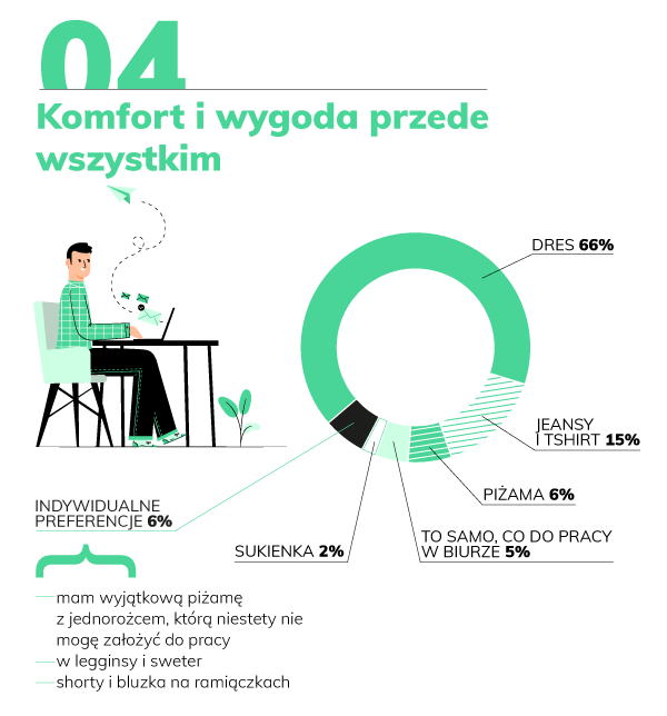 Ale przestrzeń, to nie tylko pomieszczenie w domu. W jej ramach mieści się też to, co Polacy najchętniej zakładają na siebie podczas home office. Zdecydowana większość badanych wskazała, że w tym czasie noszą wygodny dres. Ich jednogłośność jest bezsprzeczna – tak twierdzi 66%! Wygląda na to, że świetnie wpisują się w styl homfy casual! 15% woli casual – łącząc t-shirt z jeansami, a 6% przyznaje się, że nie wychodzi z piżamy (zapewne to ci, którzy powyżej wskazali pracę z łóżka ;)). Natomiast 5% badanych deklaruje, że nadal ubiera to samo, co na co dzień do pracy w biurze.