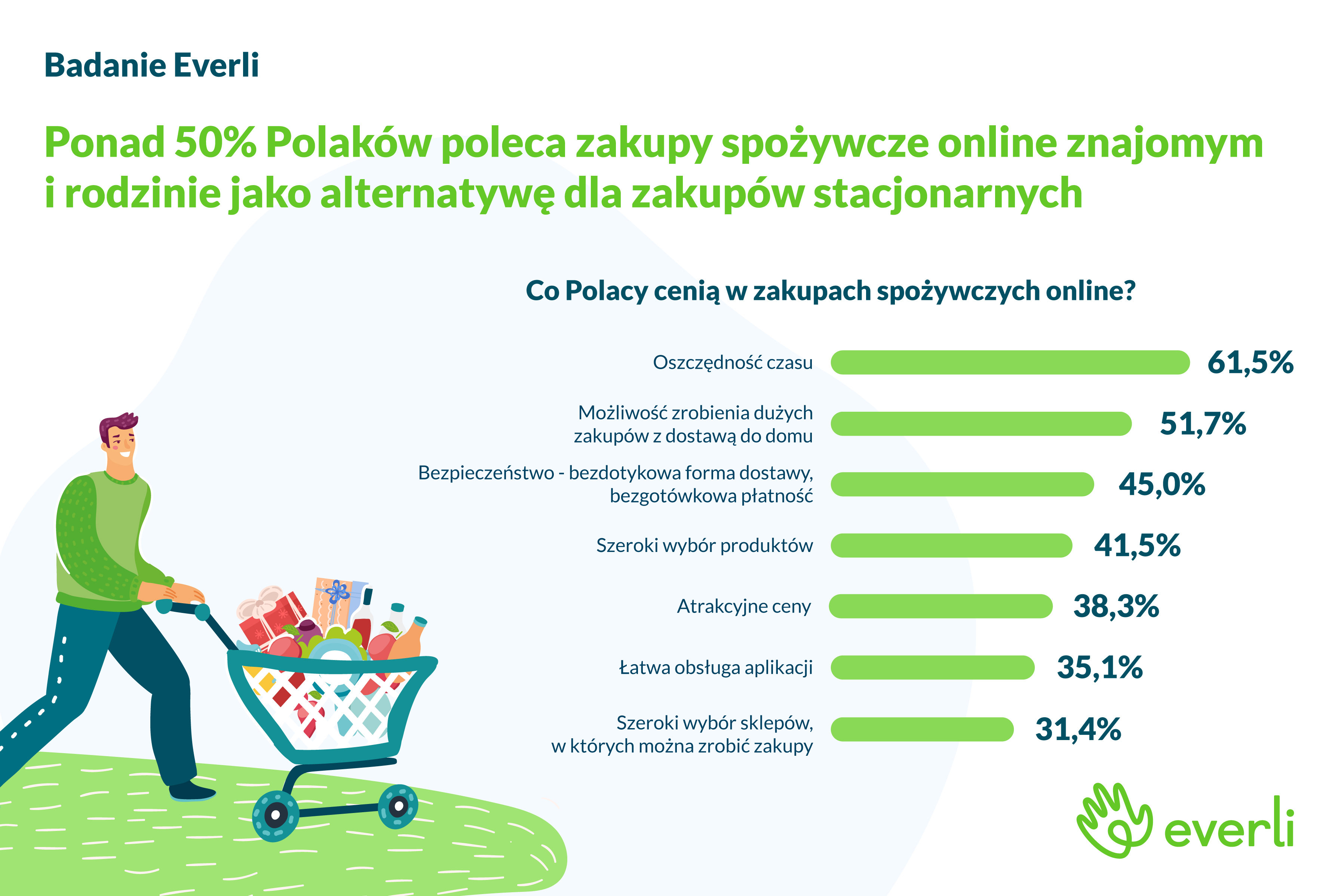 Wyniki badania przeprowadzonego przez SW Research na zlecenie Everli wykazały, że aż 34 proc. Polaków poleciłoby zakupy online swojej rodzinie bądź znajomym, jako alternatywę do zakupów tradycyjnych. Ponad 66 proc. Polaków zachęciłoby swoich bliskich do zrobienia zakupów online, ponieważ jest to wygodny sposób – łatwiej zrobić zakupy z domu lub w przerwie podczas pracy. Co więcej, prawie 60 proc. badanych zwraca uwagę na bezpieczeństwo zakupów online, dzięki którym możemy ograniczyć kontakty z innymi do minimum, a tym samym ochronić siebie i swoją rodzinę przed zakażeniem koronawirusem.