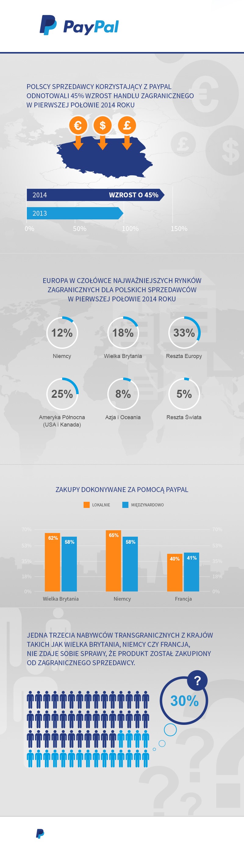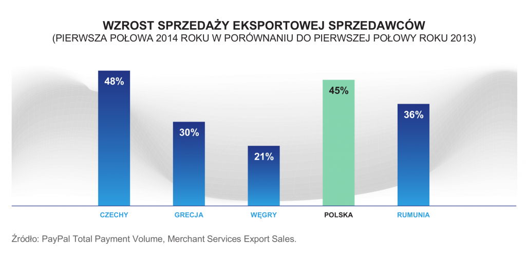 Płatności zagraniczne, dokonywane za pomocą PayPal, wzrosły w pierwszej połowie 2014 roku o 45 proc. (w stosunku do pierwszej połowy 2013 roku). Kluczowe kategorie eksportowe obejmowały: oprogramowanie komputerowe i gry, sprzęt sportowy, rękodzieła, części samochodowe, sprzęt komputerowy i elektroniczny, kosmetyki, modę i usługi internetowe. W 2014 roku, ponad 10 tysięcy aktywnych sprzedawców w Europie Środkowo-Wschodniej współpracowało z PayPal, w celu rozwinięcia swojej międzynarodowej działalności.